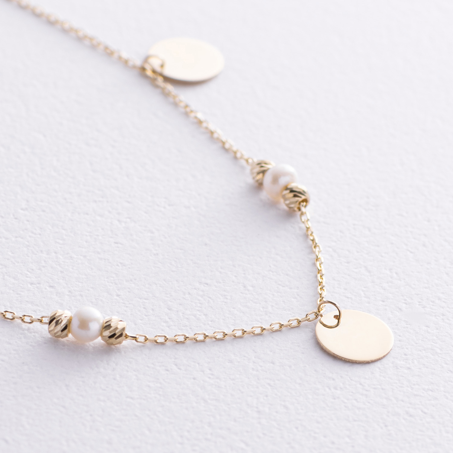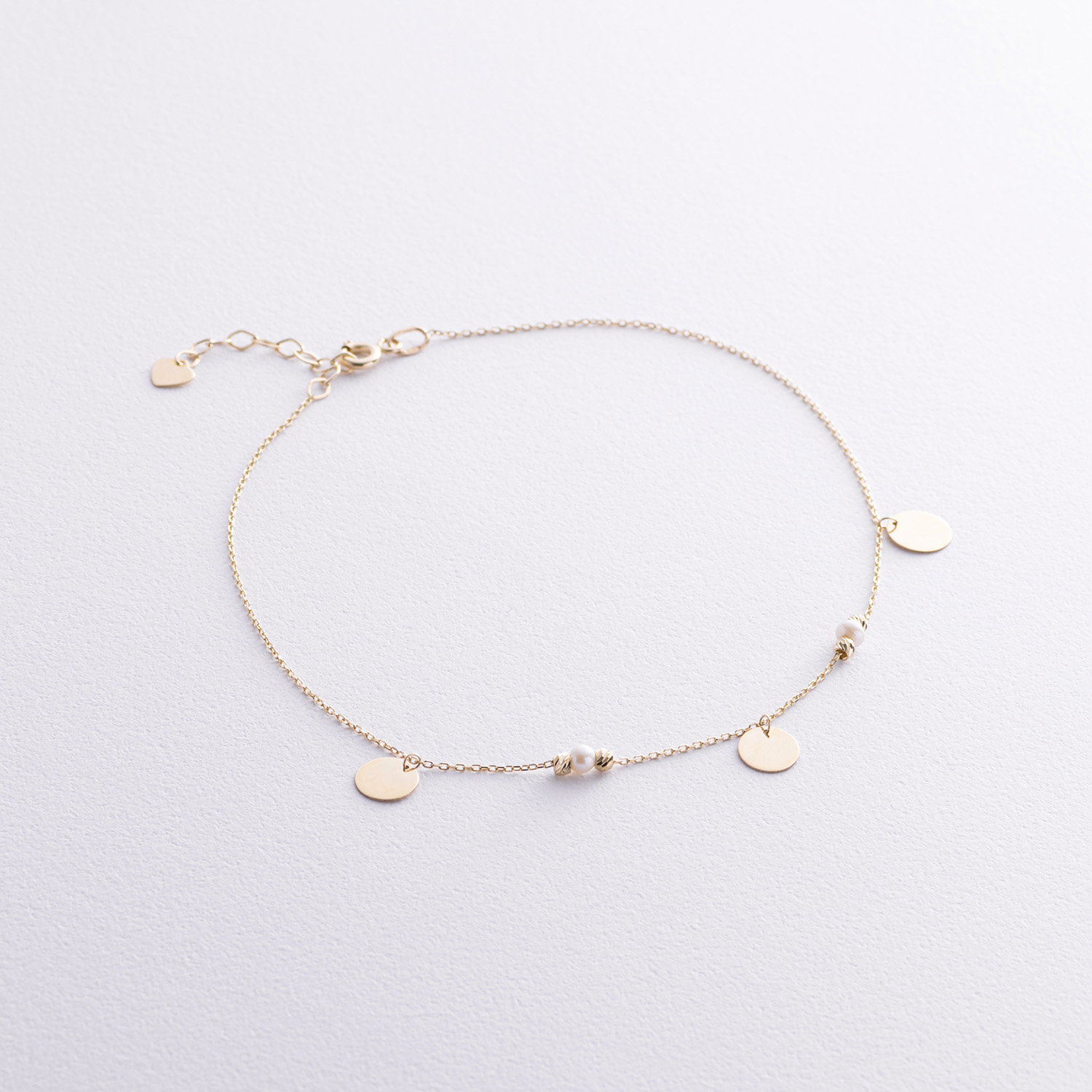 Браслет "Монетки и шарики" с жемчугом на ногу (желтое золото) б05368