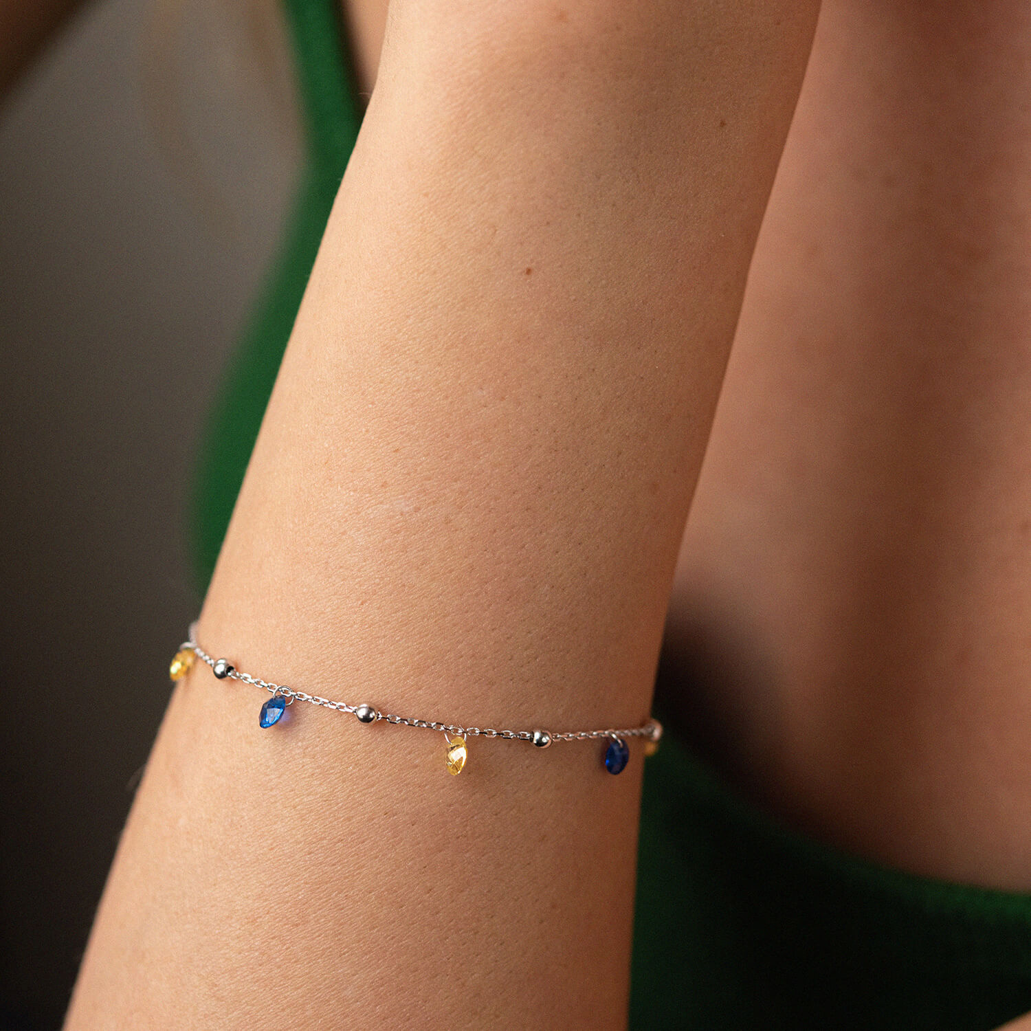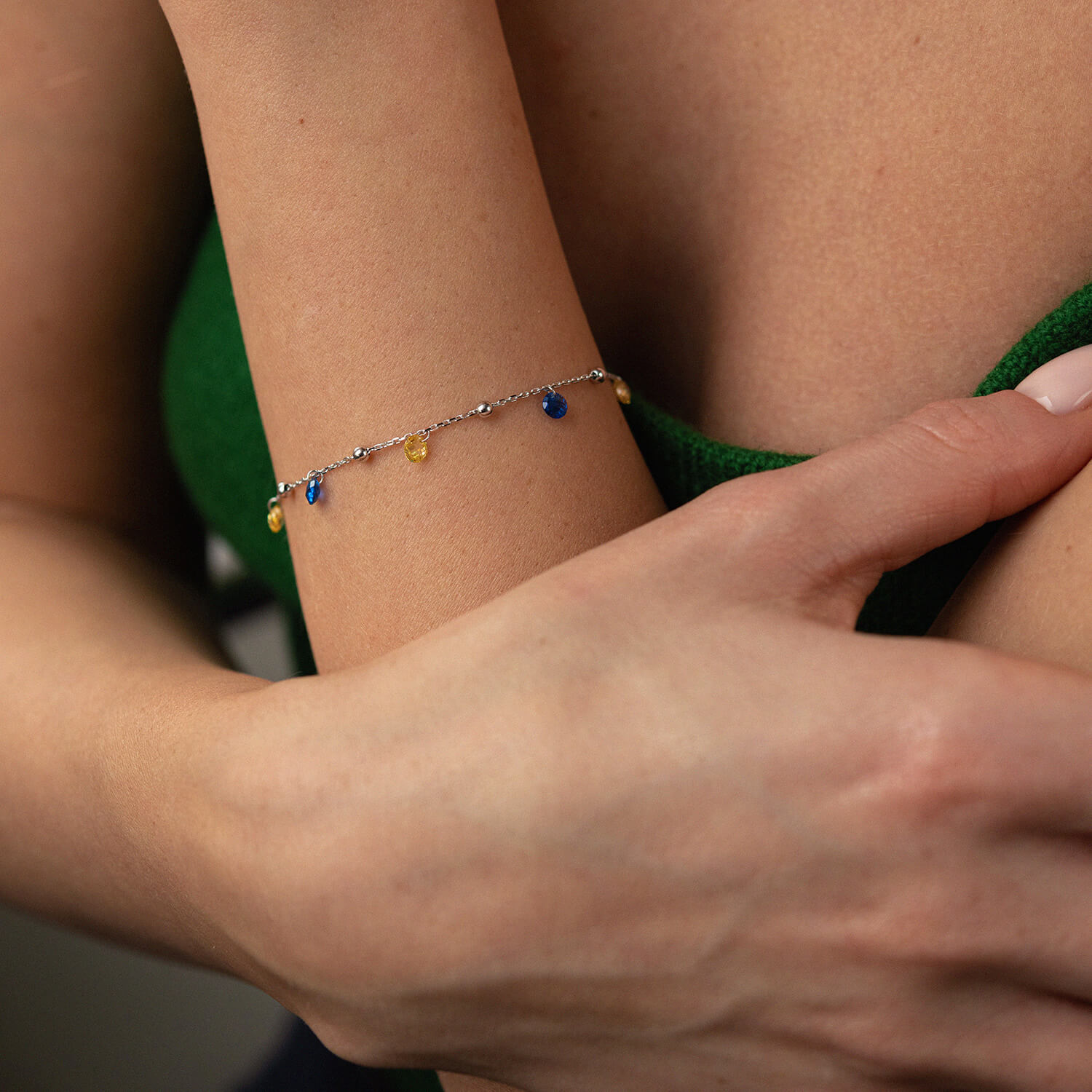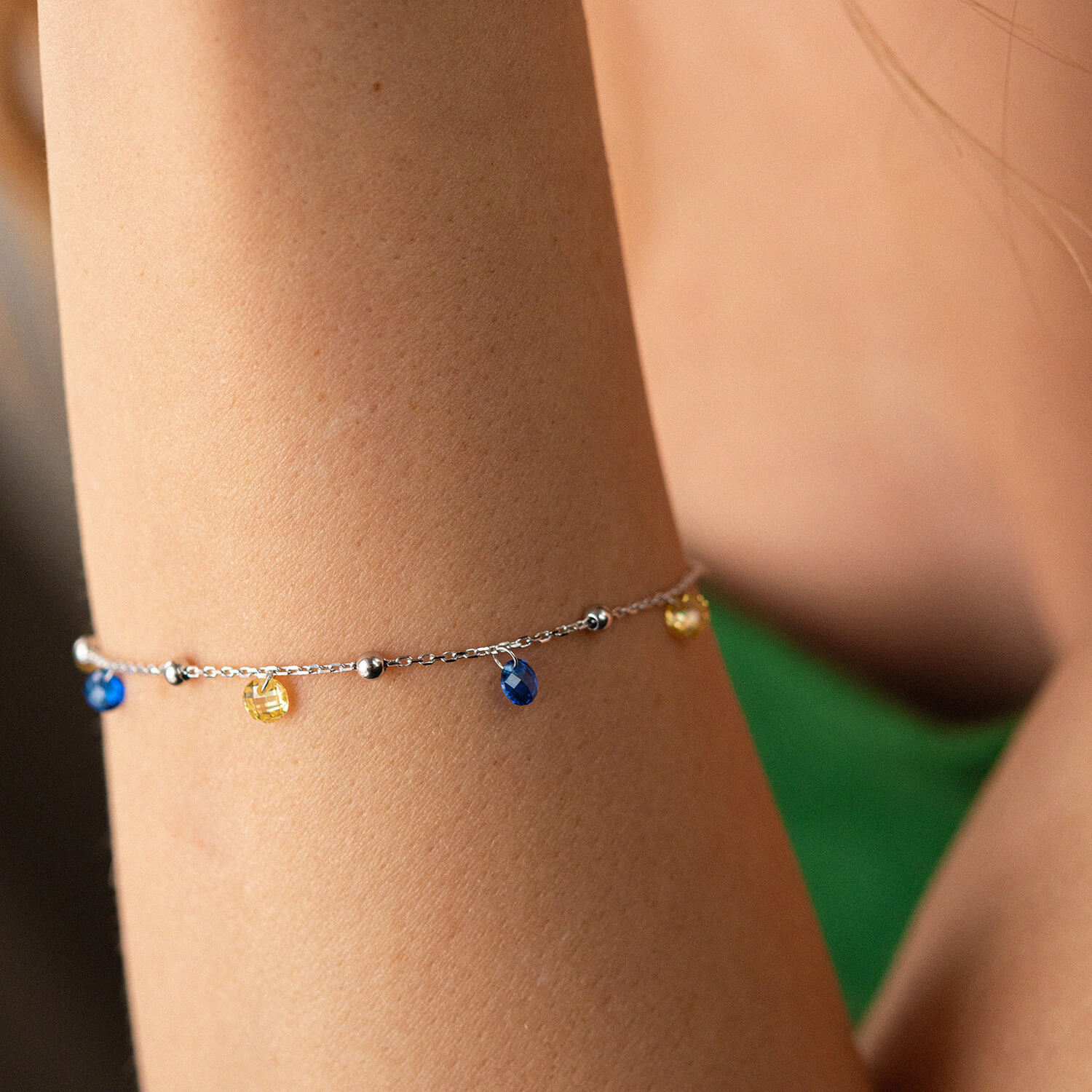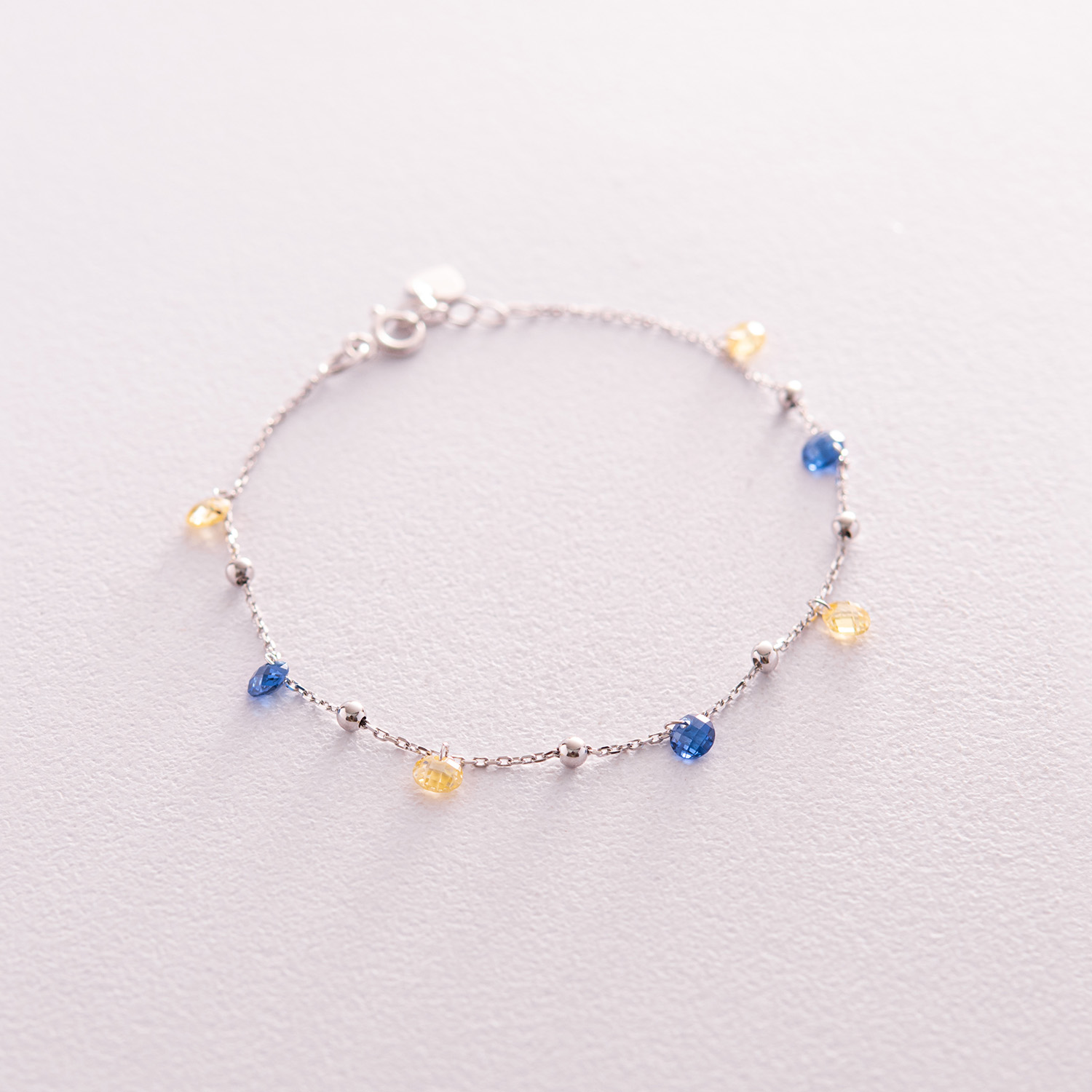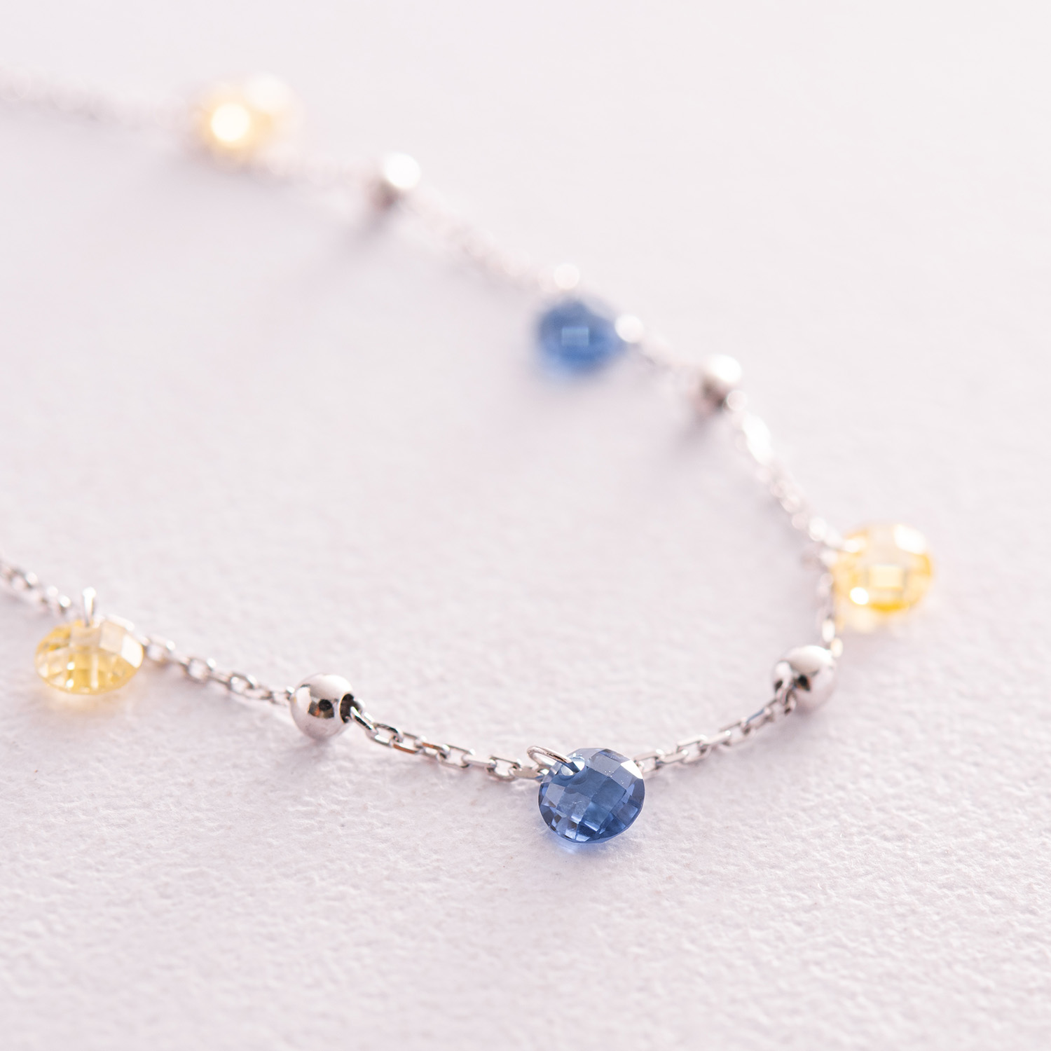 Браслет "Независимая" с шариками в белом золоте (синие и желтые фианиты) б05171