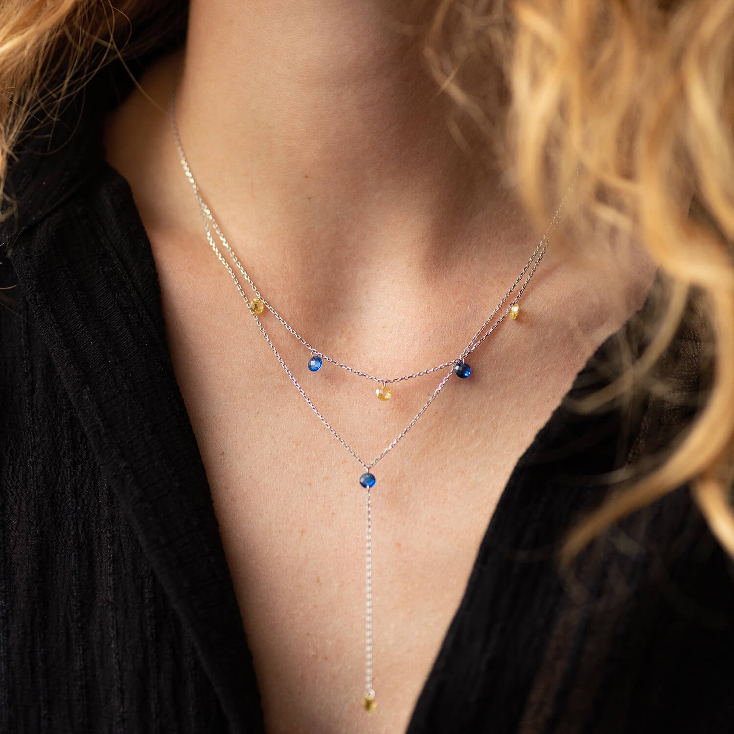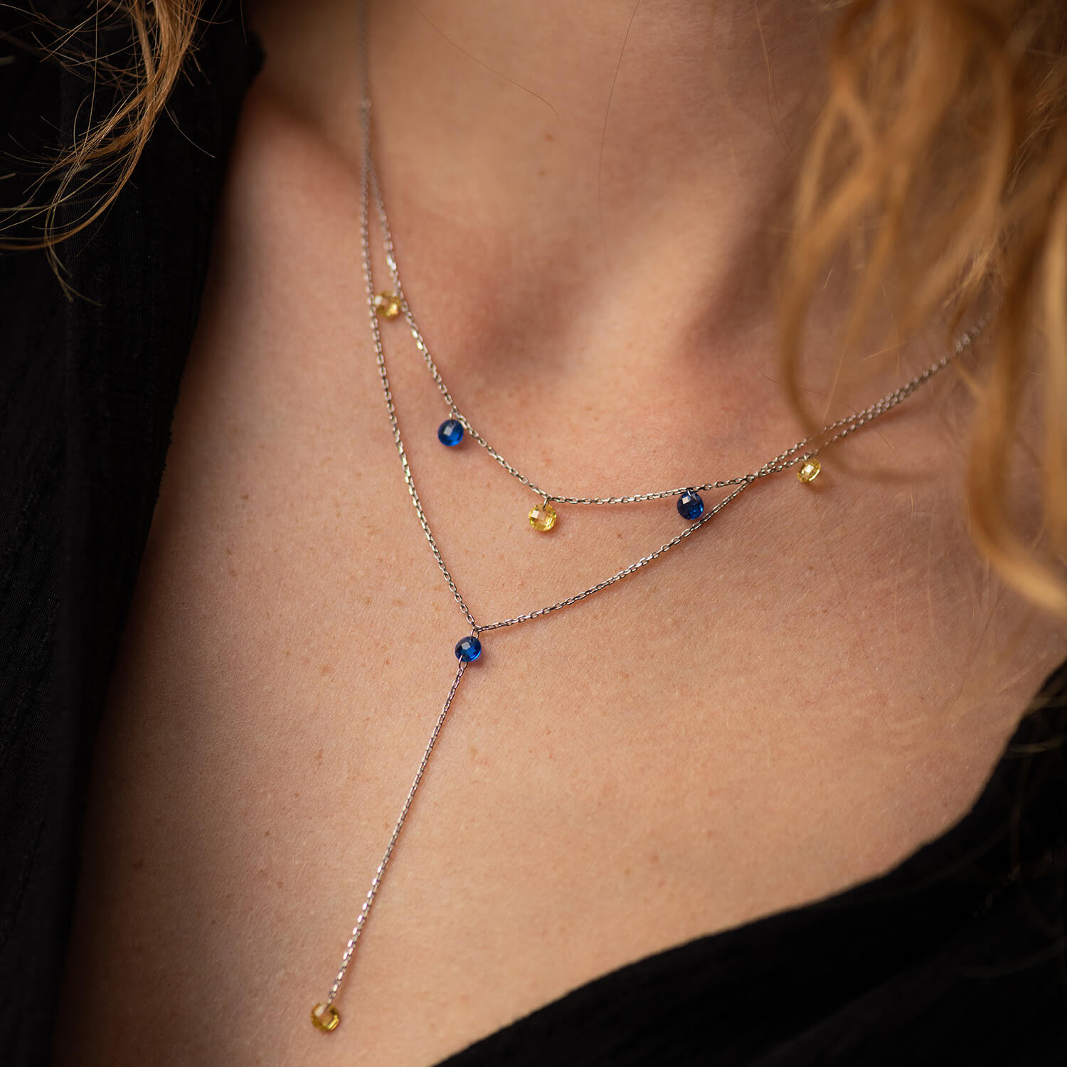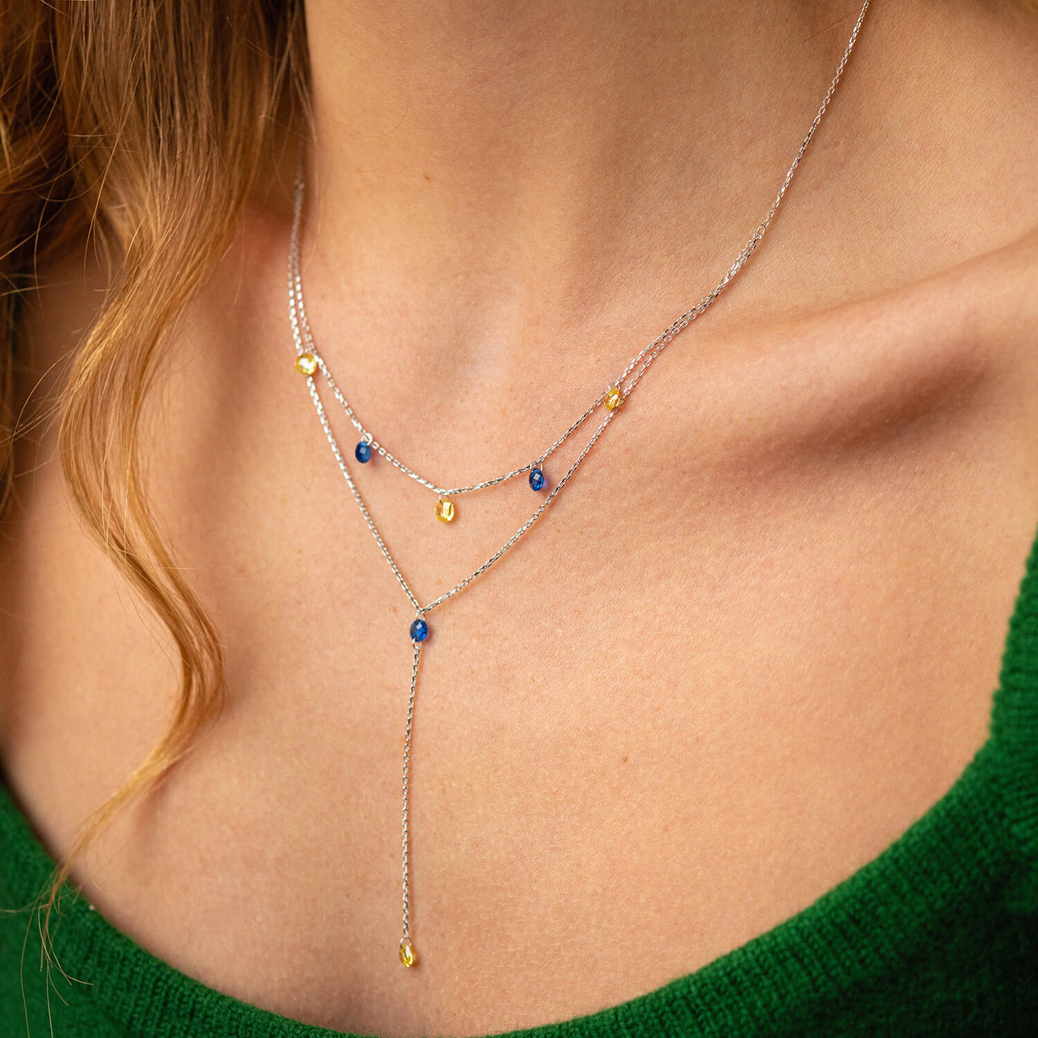 Двойное золотое колье - галстук "Украинка" (синие и желтые фианиты) кол02332