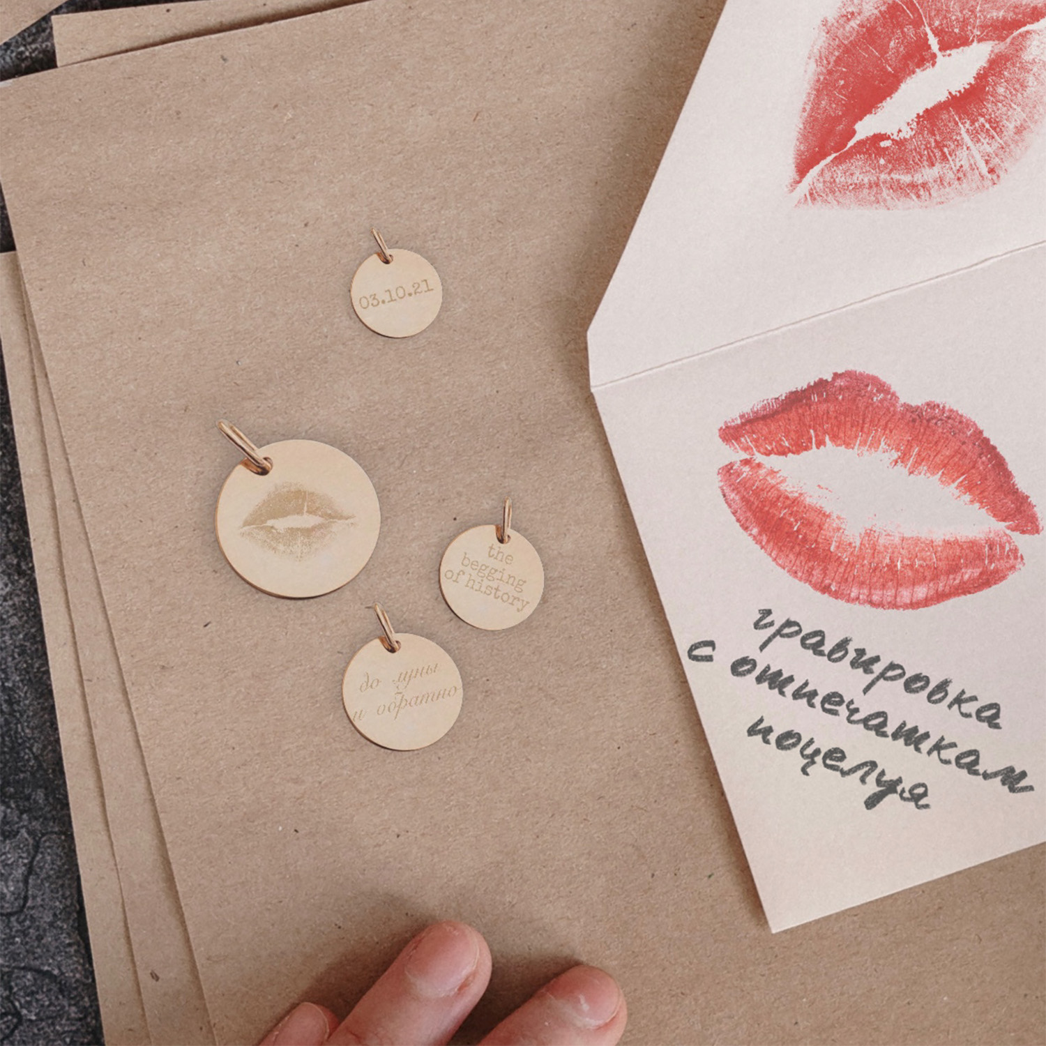 Кулон с гравировкой "Отпечаток поцелуя" в желтом золоте (17 мм) п03435п