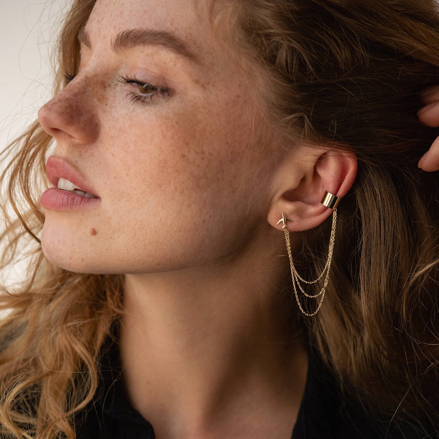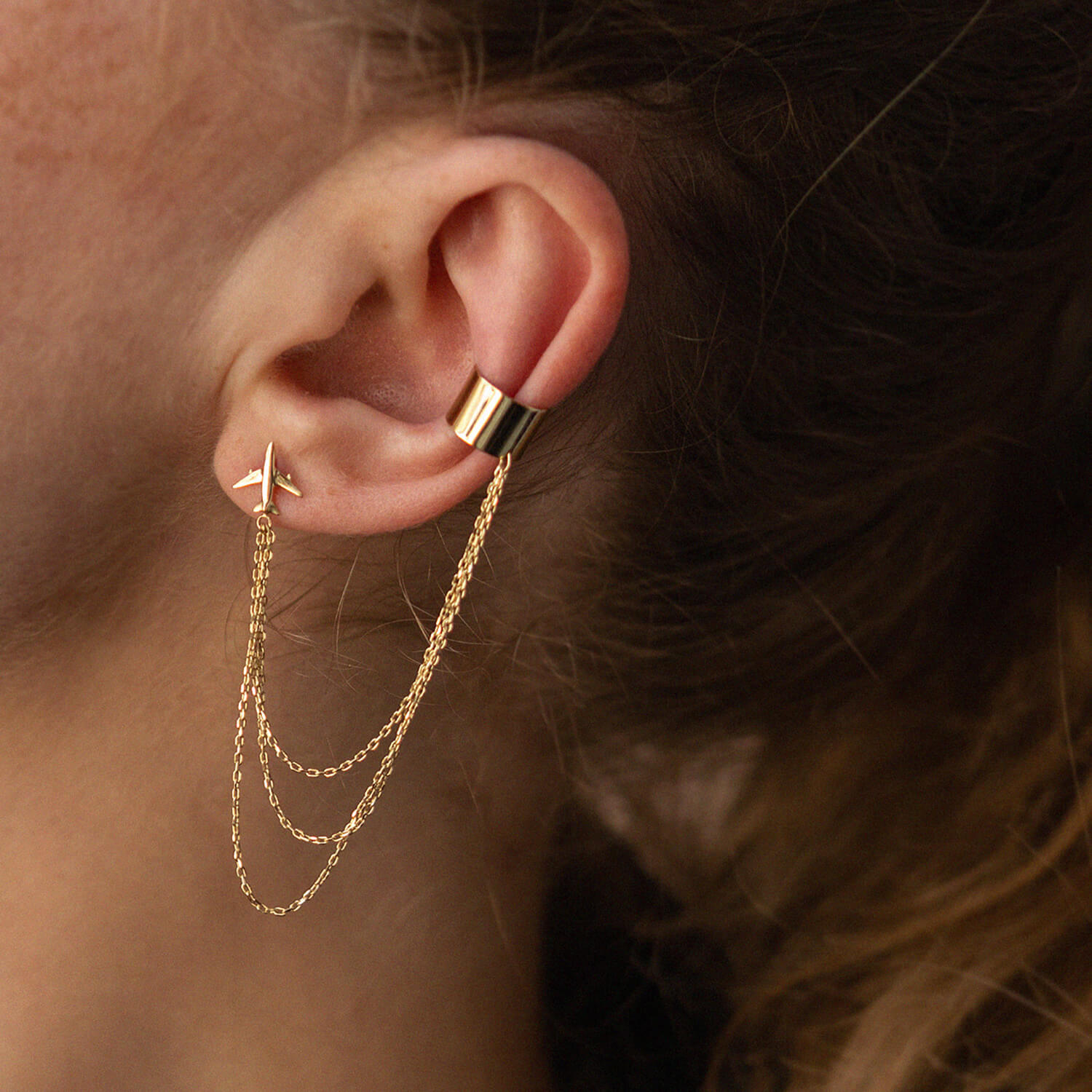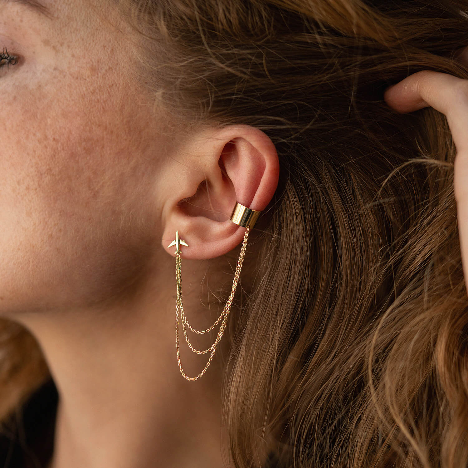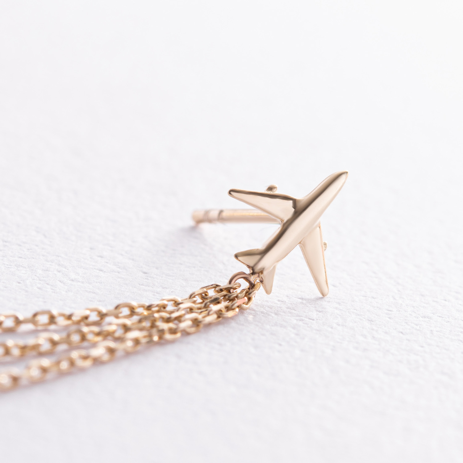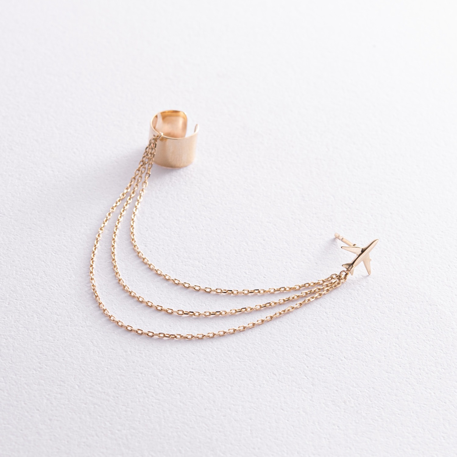 Серьга - каффа "Самолет" в желтом золоте с цепочками с08385
