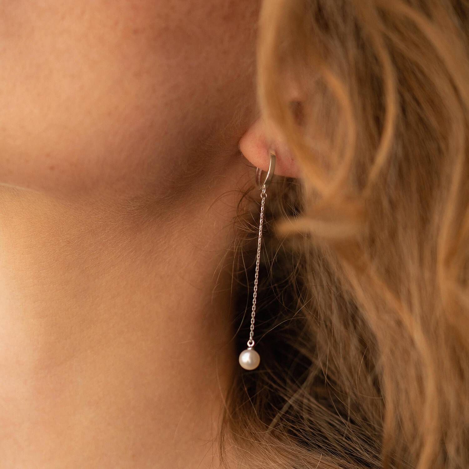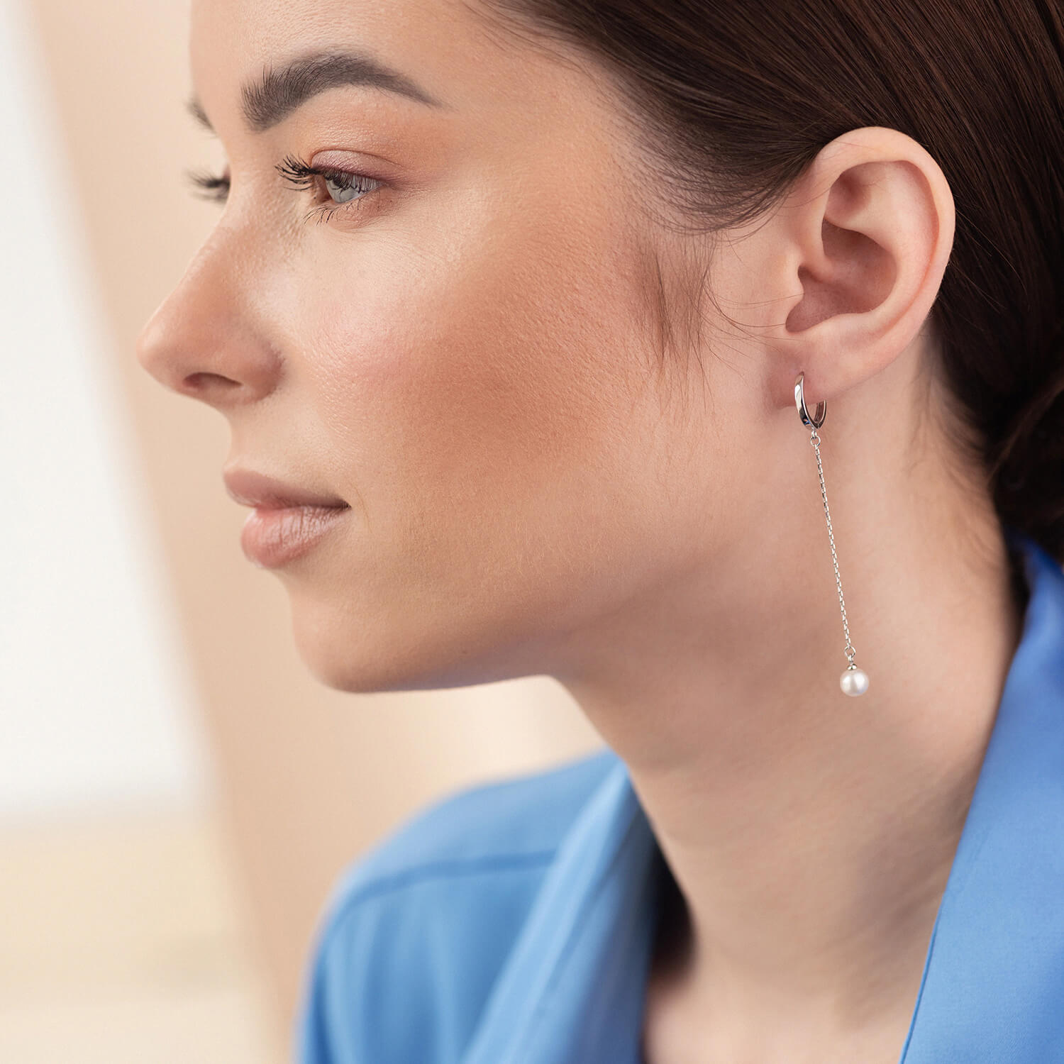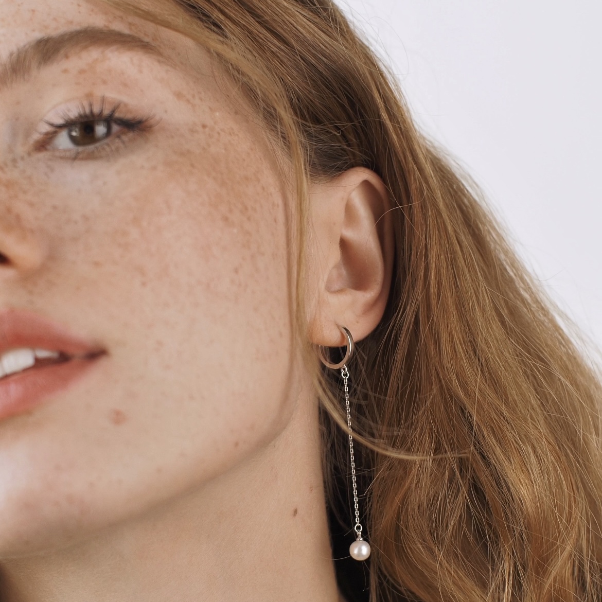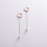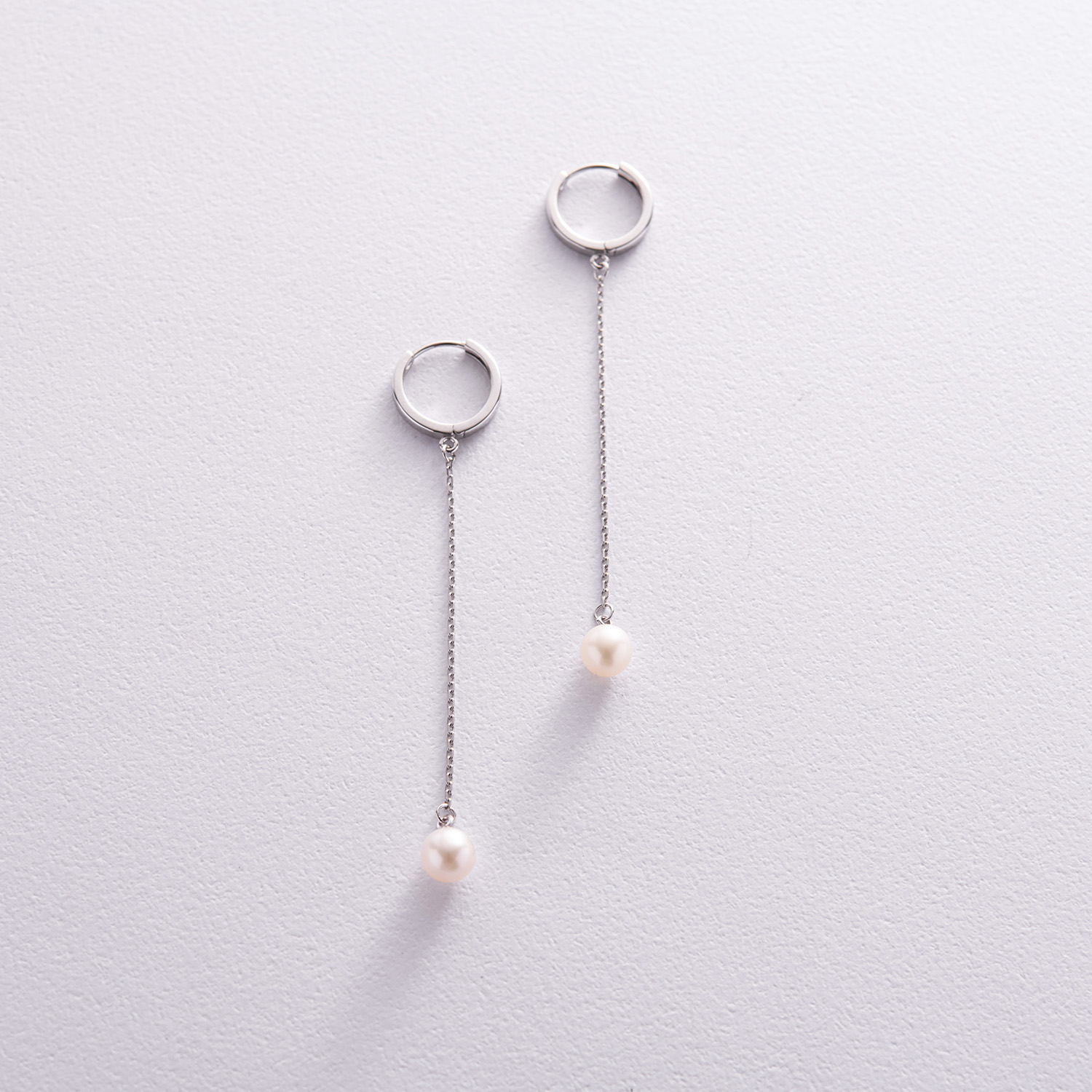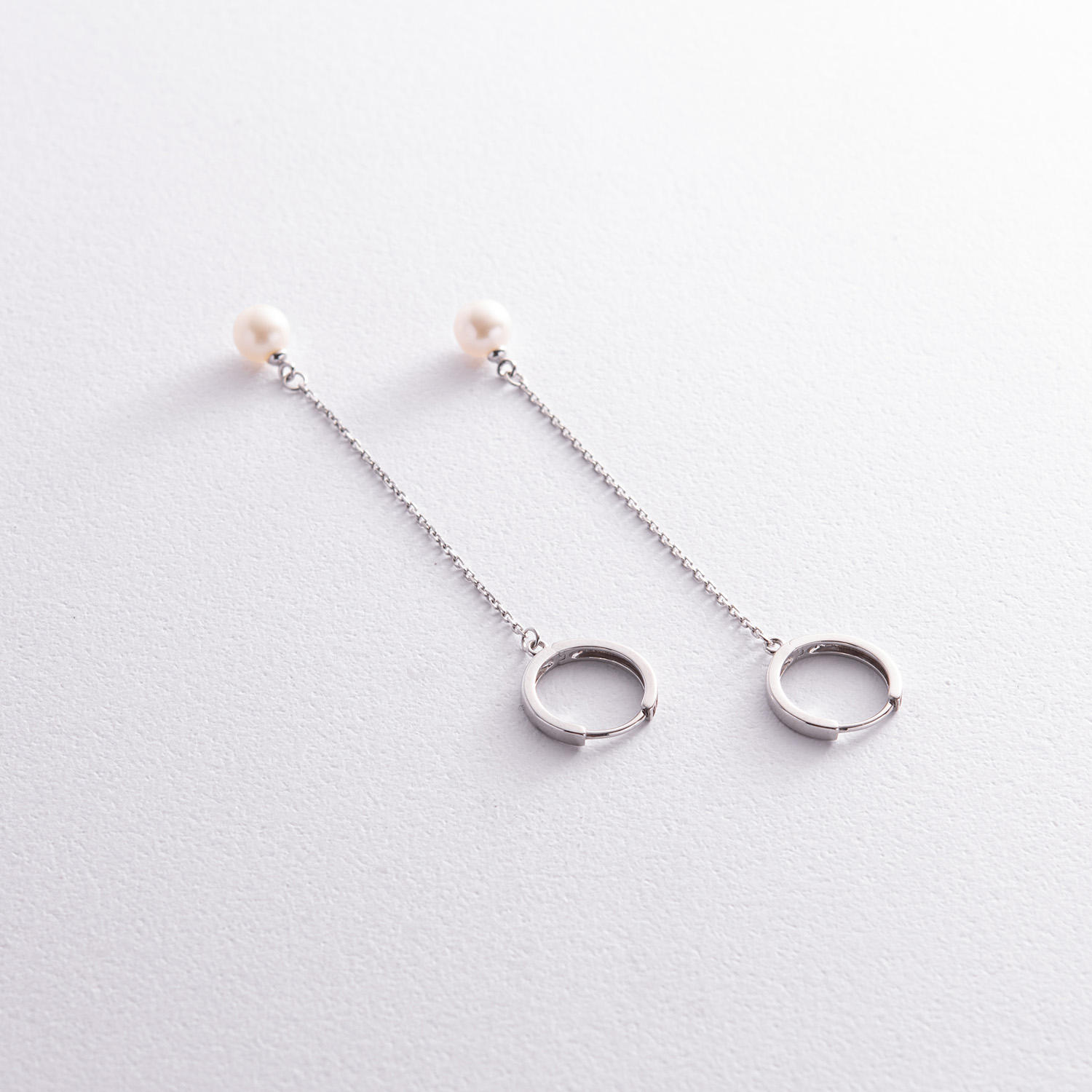 Серьги - кольца "Жемчужина на цепочке" в белом золоте с08357