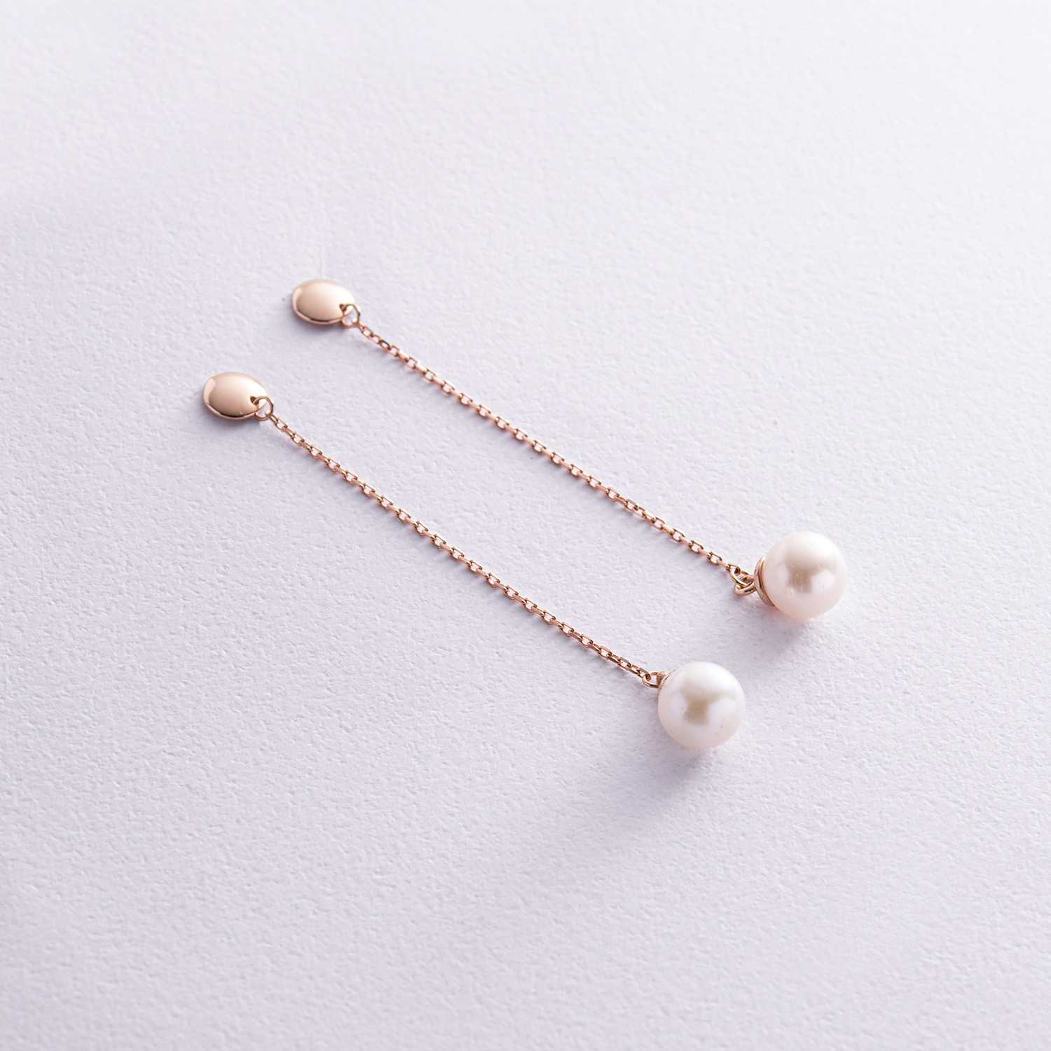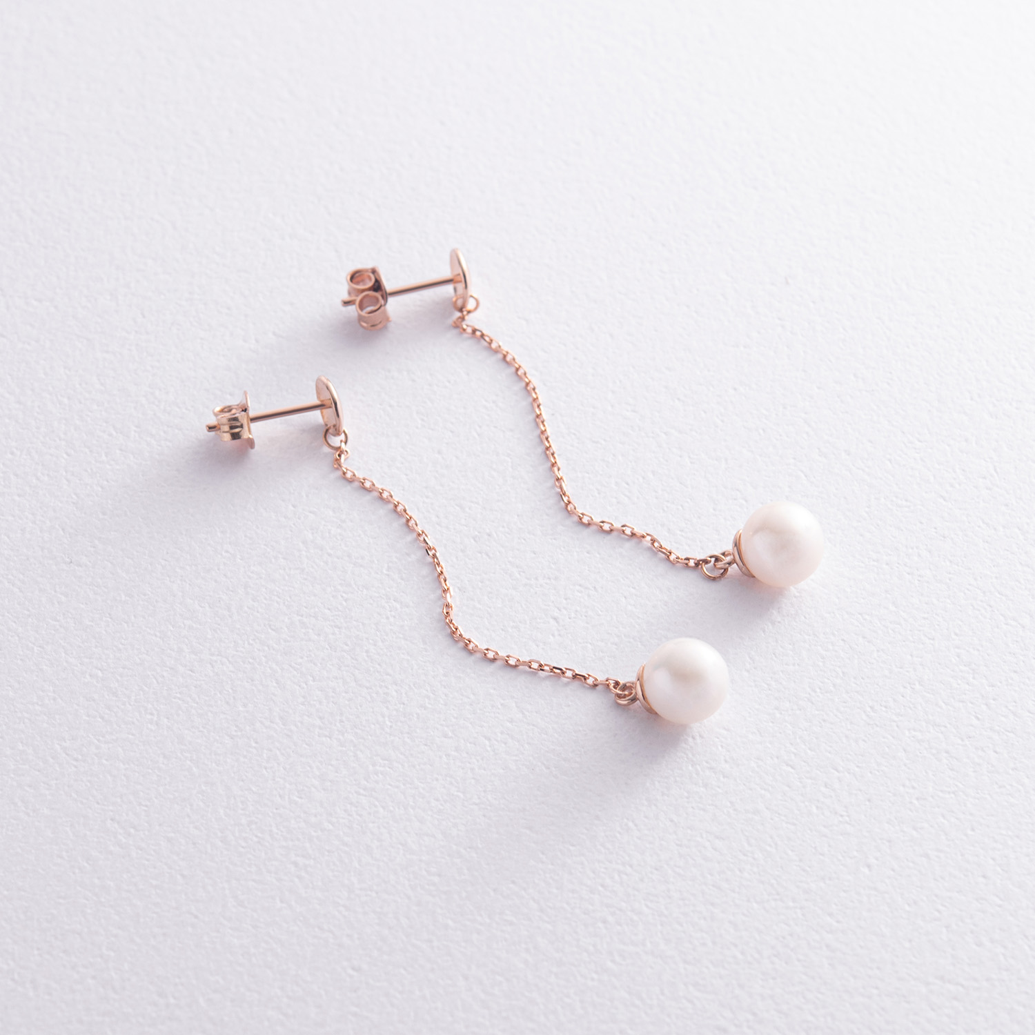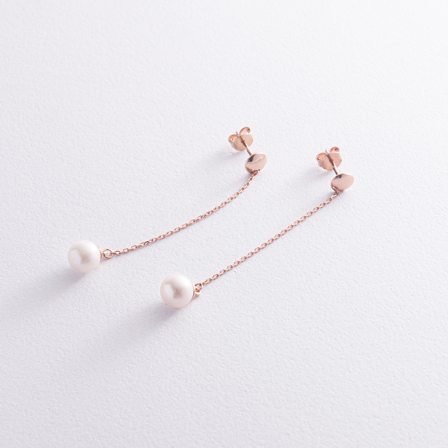 Серьги - пусеты "Жемчужина на цепочке" в красном золоте с08315