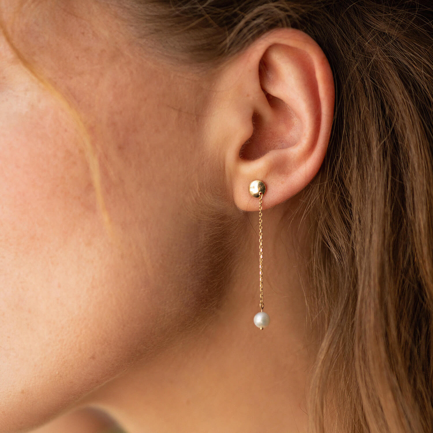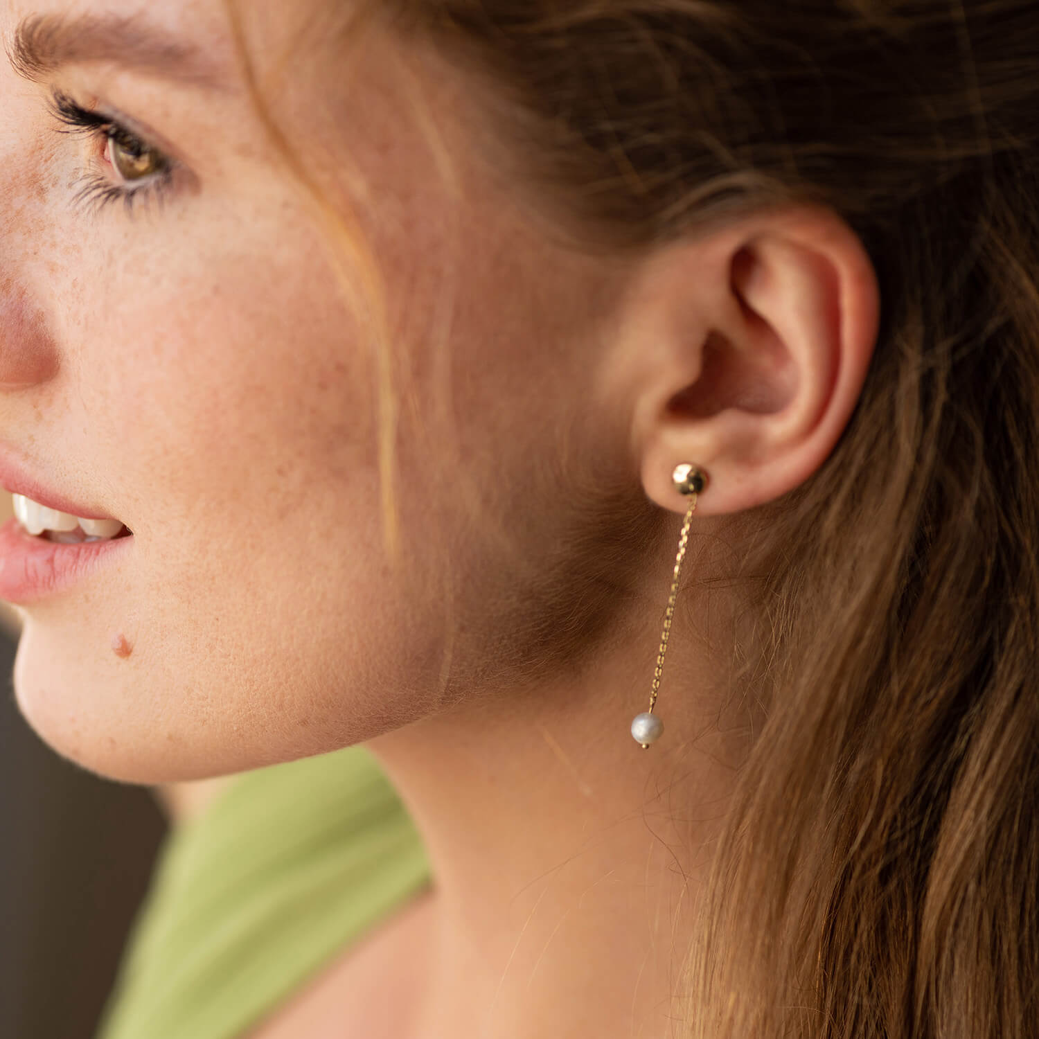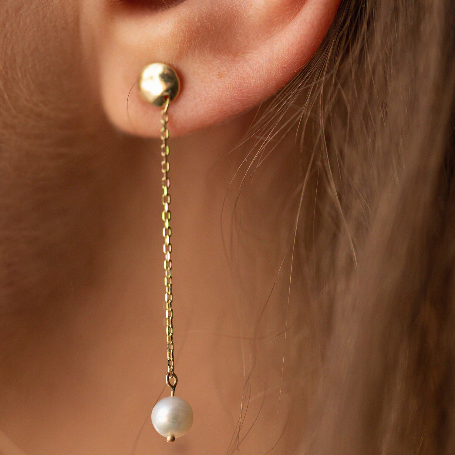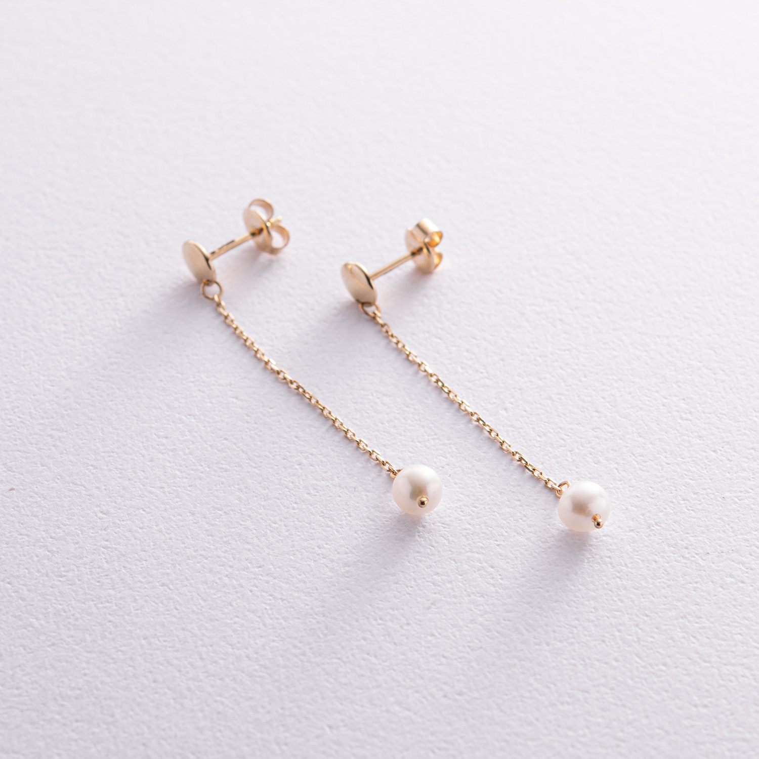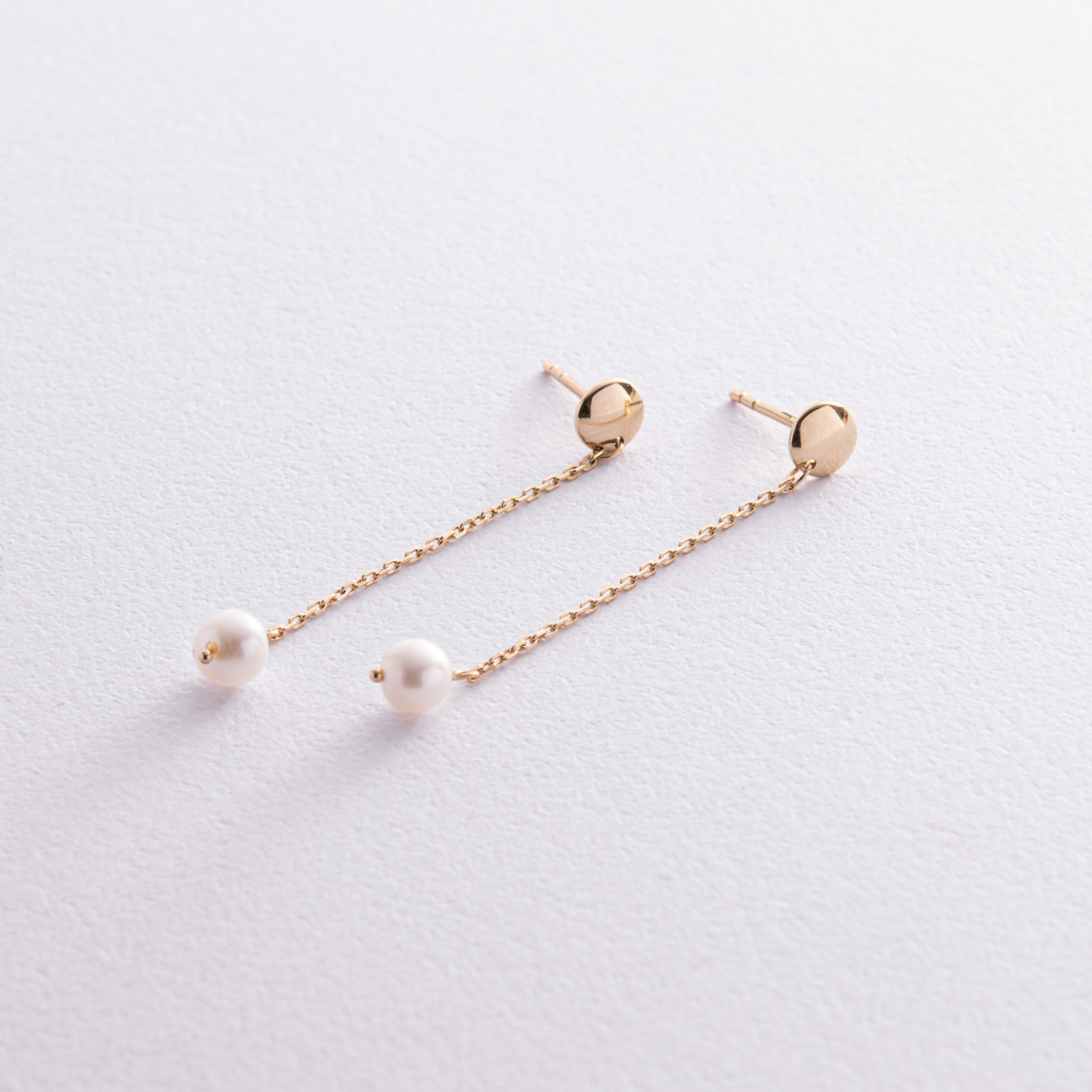 Серьги - пусеты "Жемчужина на цепочке" в желтом золоте с08293