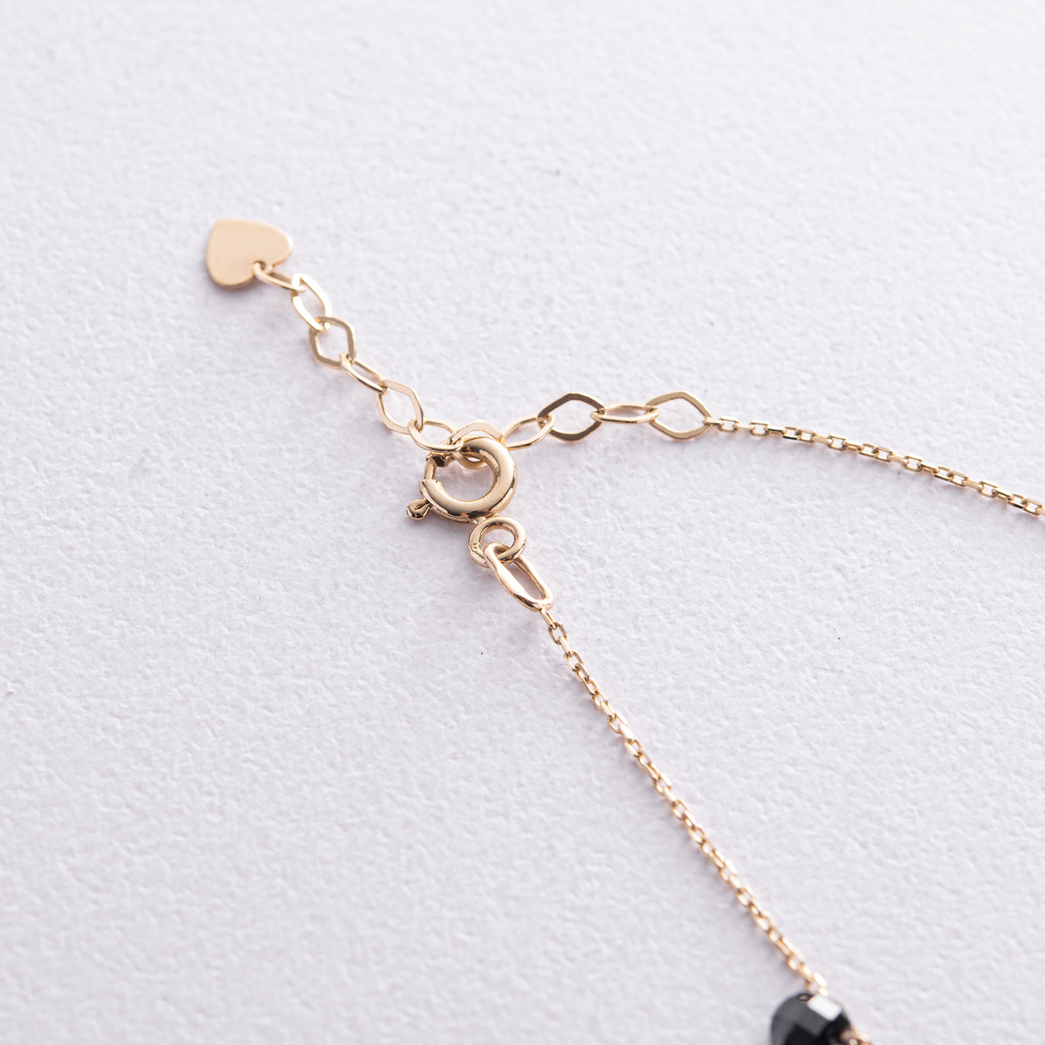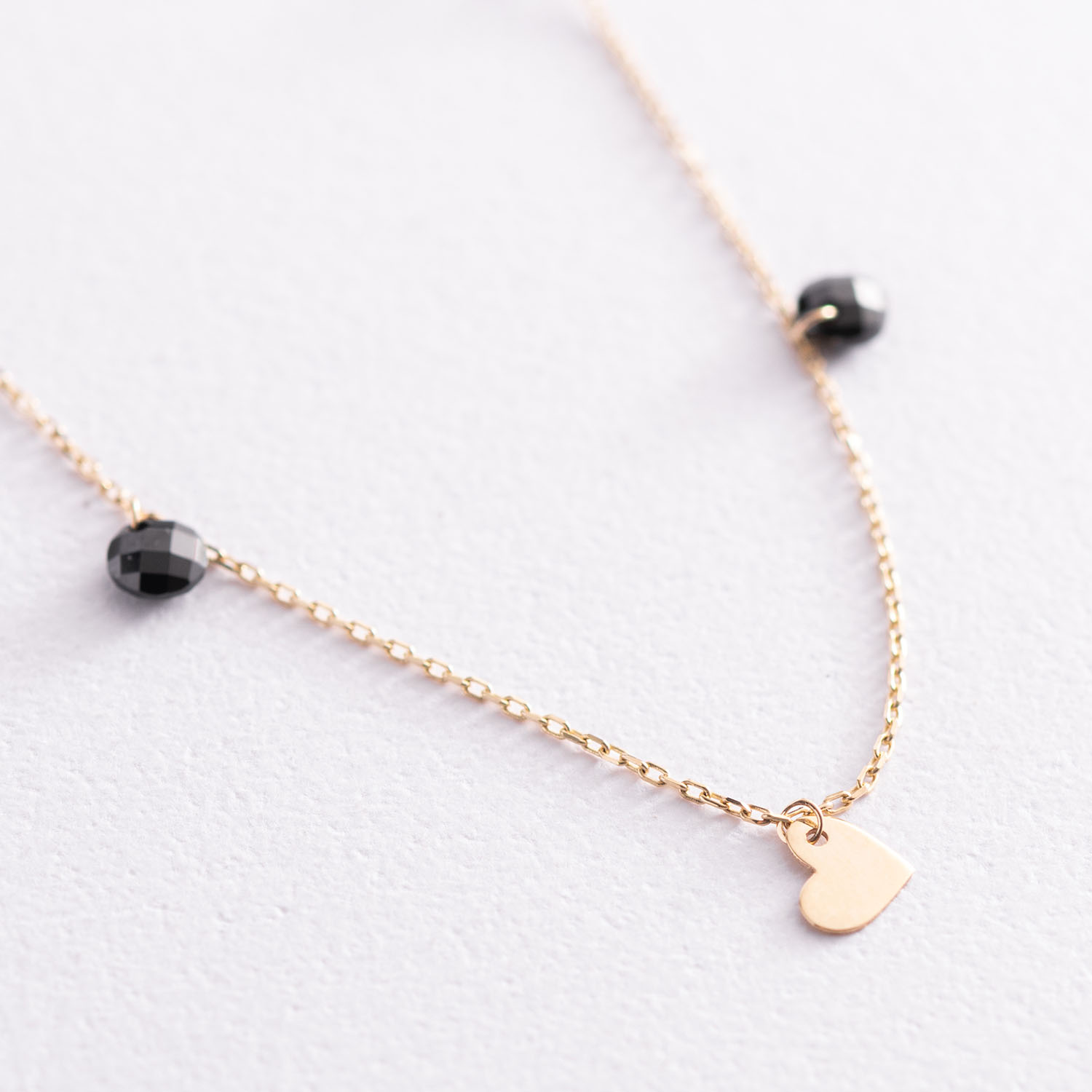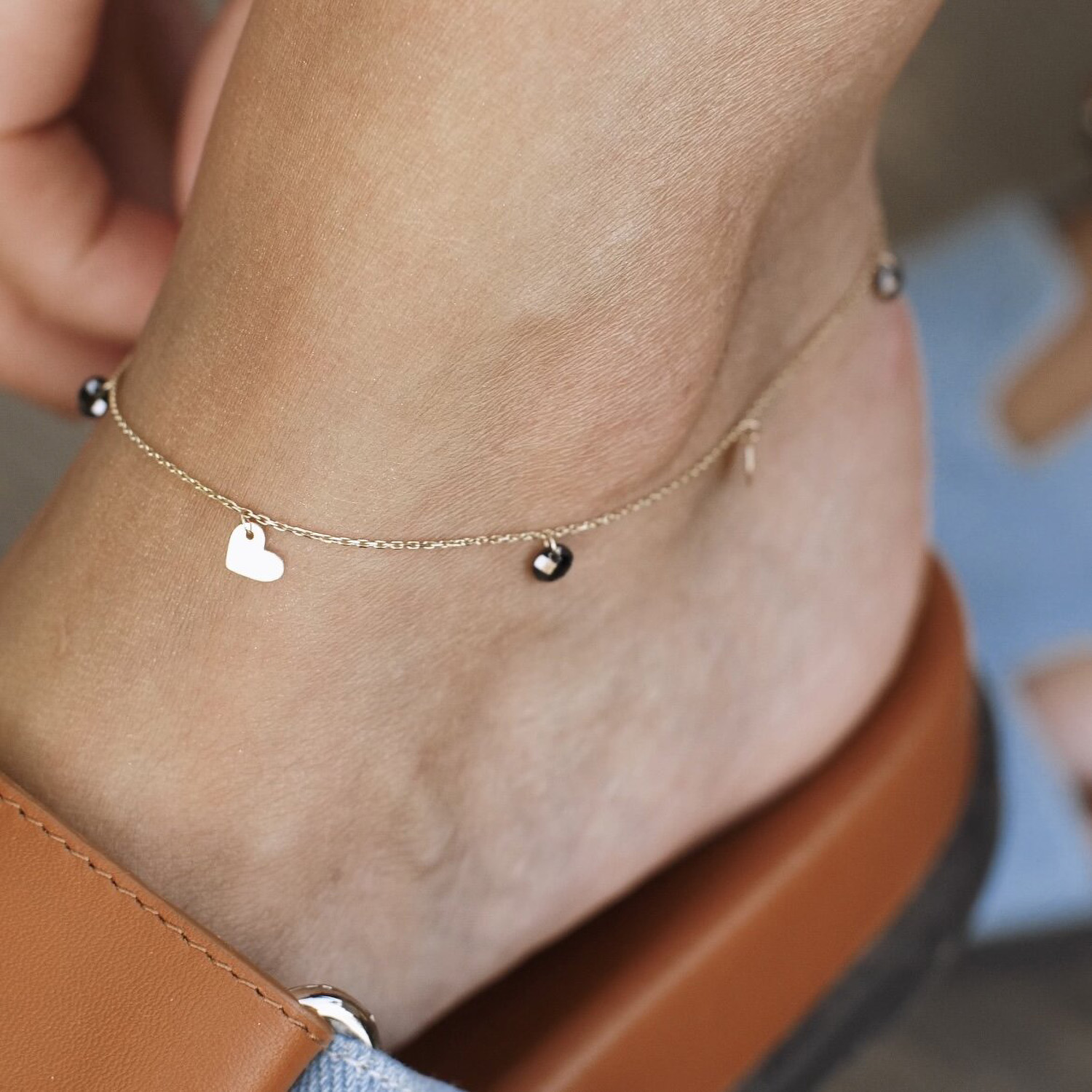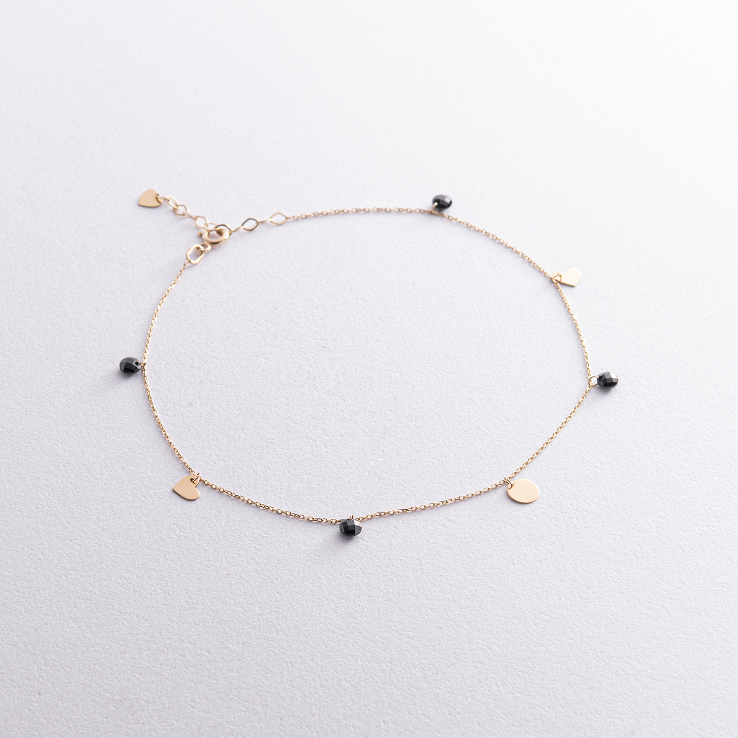 Золотой браслет "Сердечки и монетка" на ногу (черные фианиты) б04796