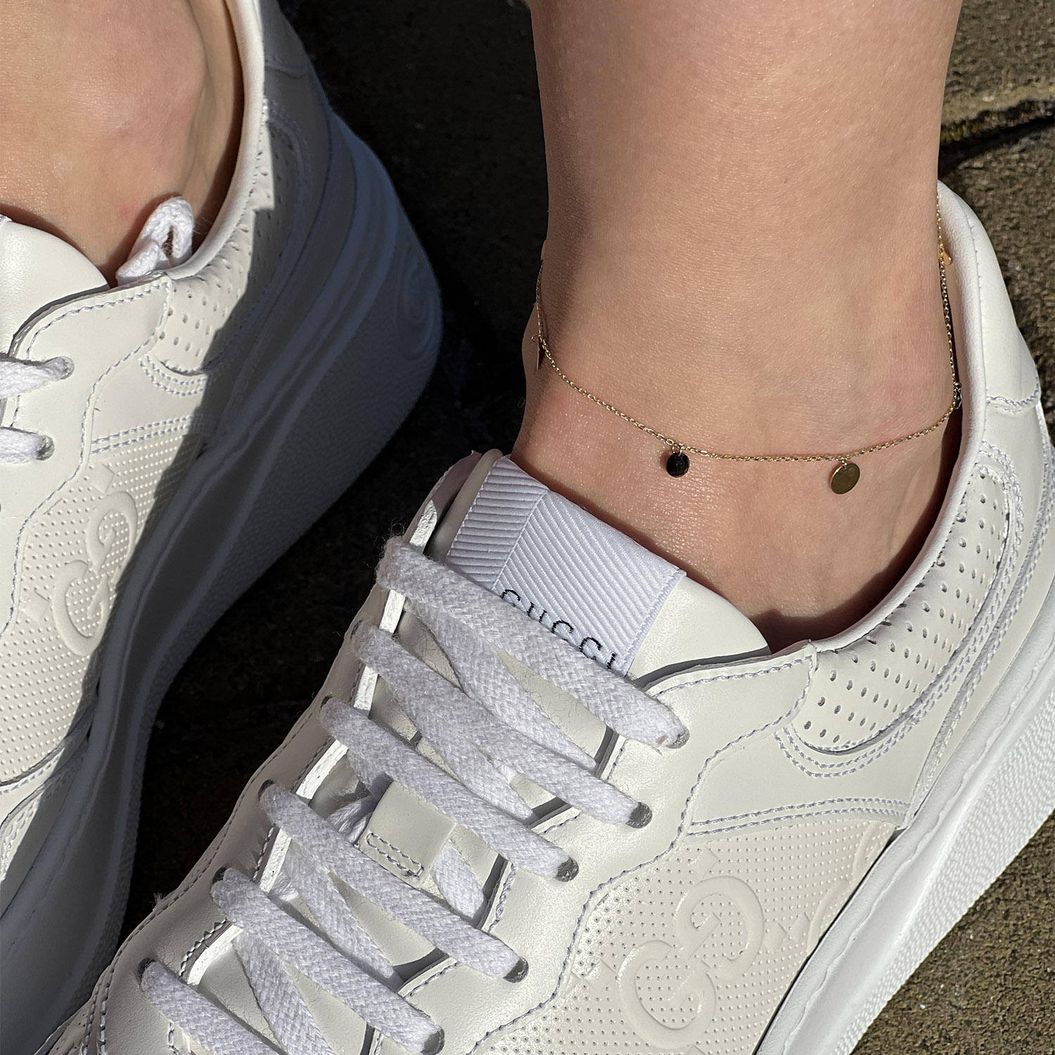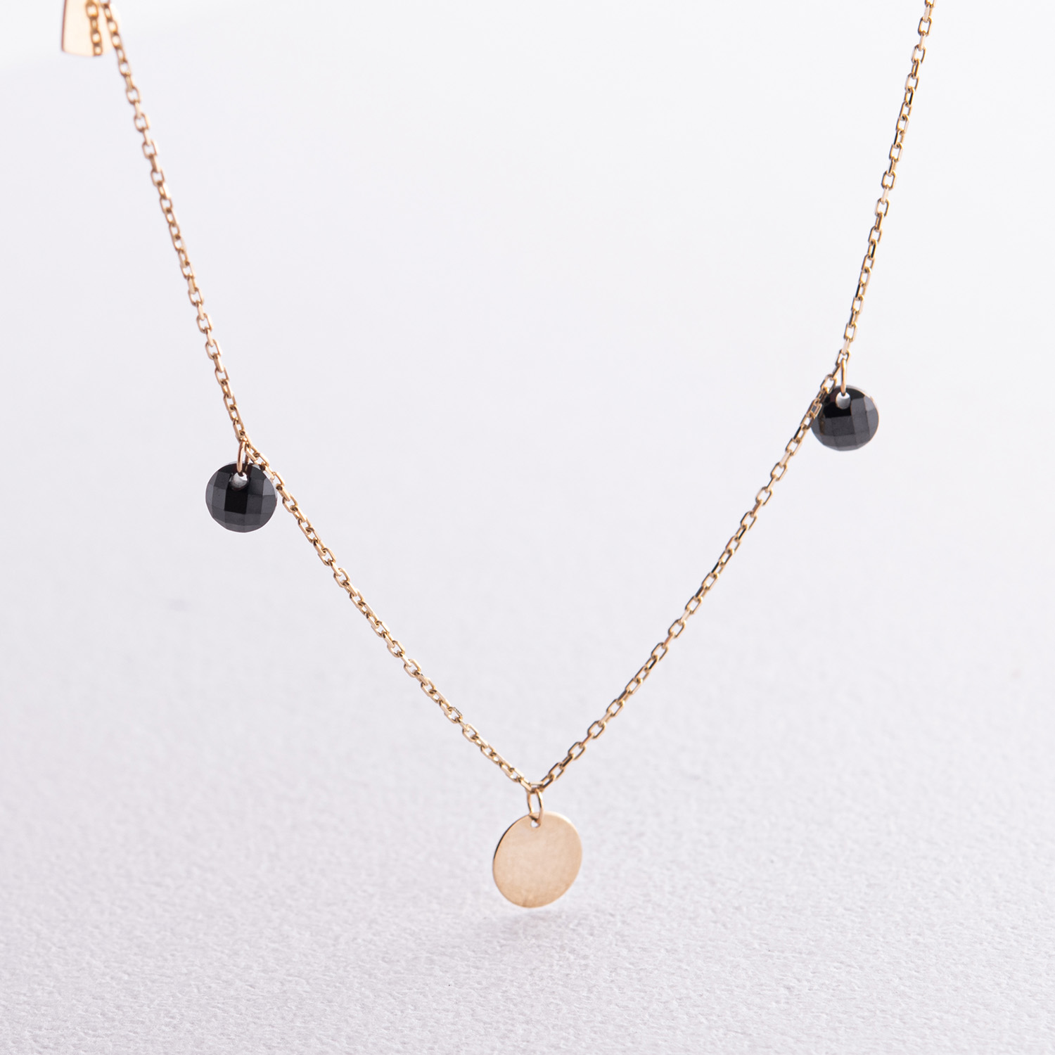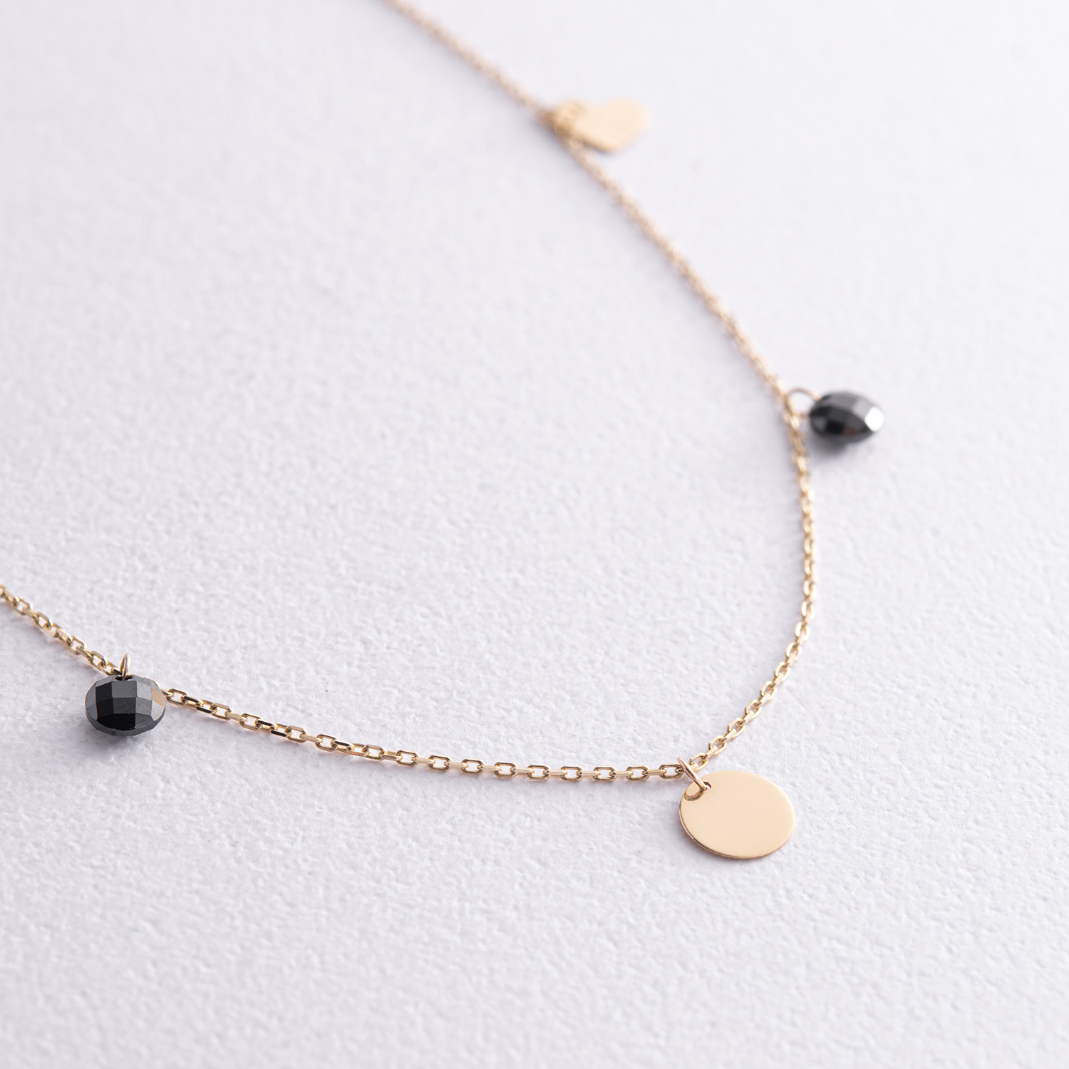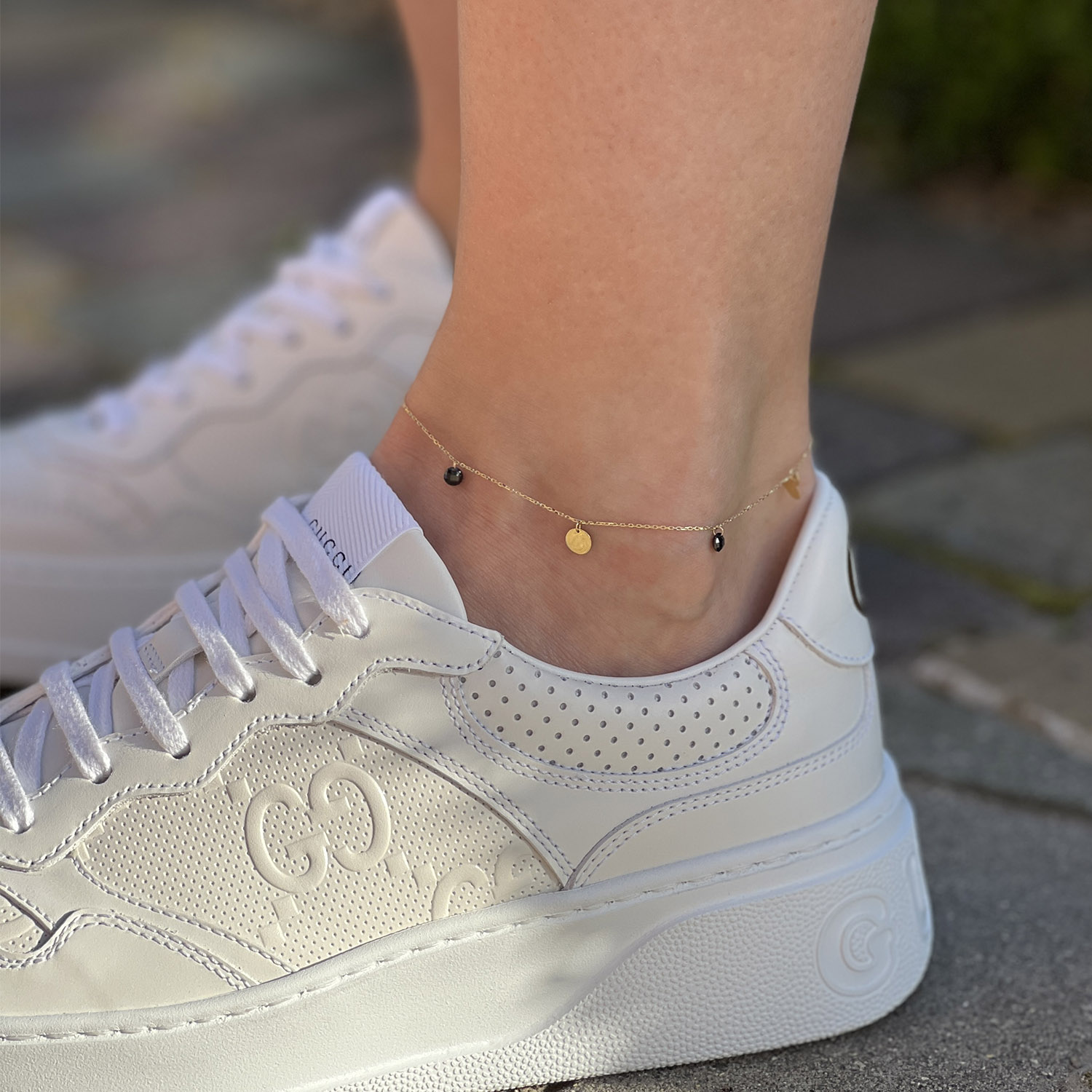 Золотой браслет "Сердечки и монетка" на ногу (черные фианиты) б04796
