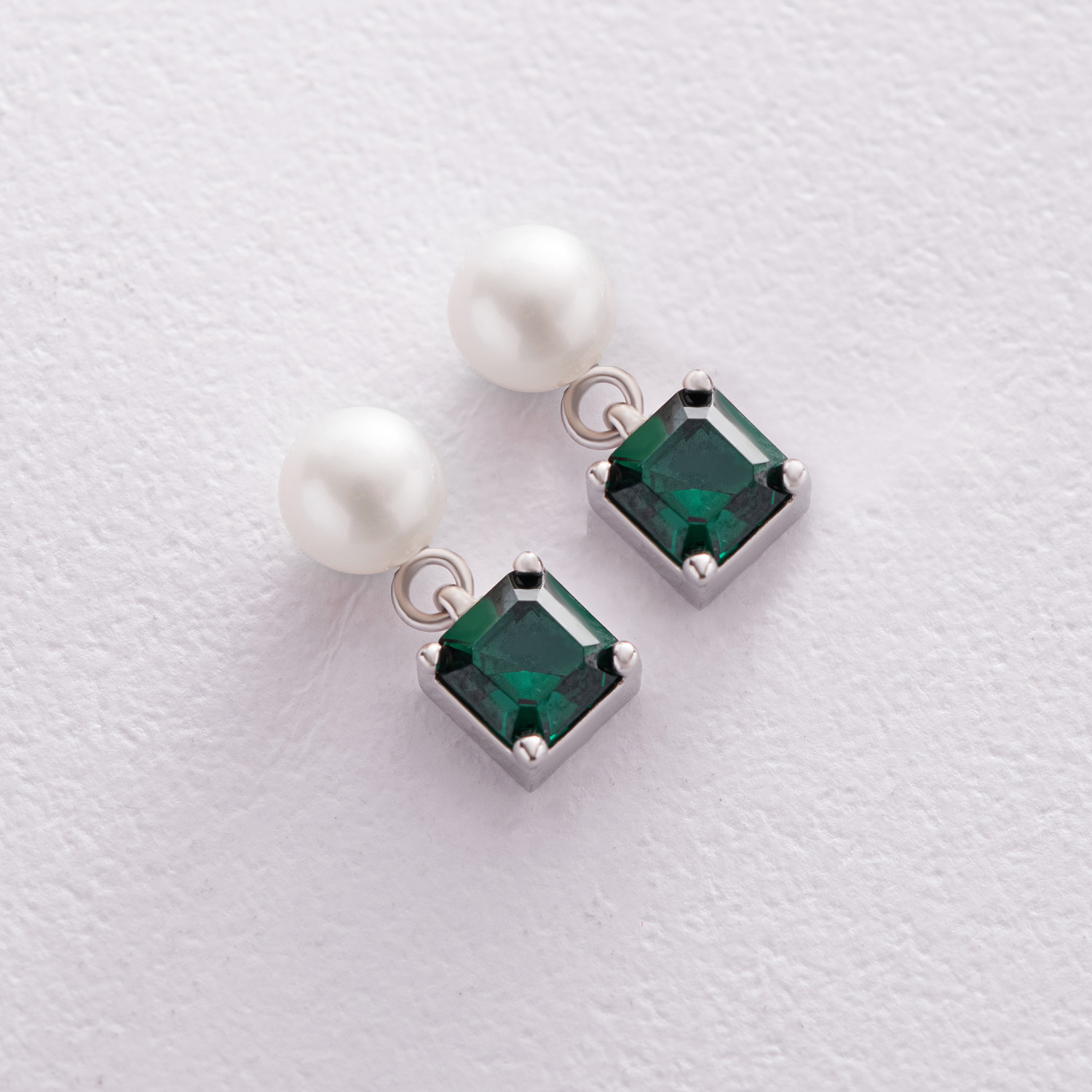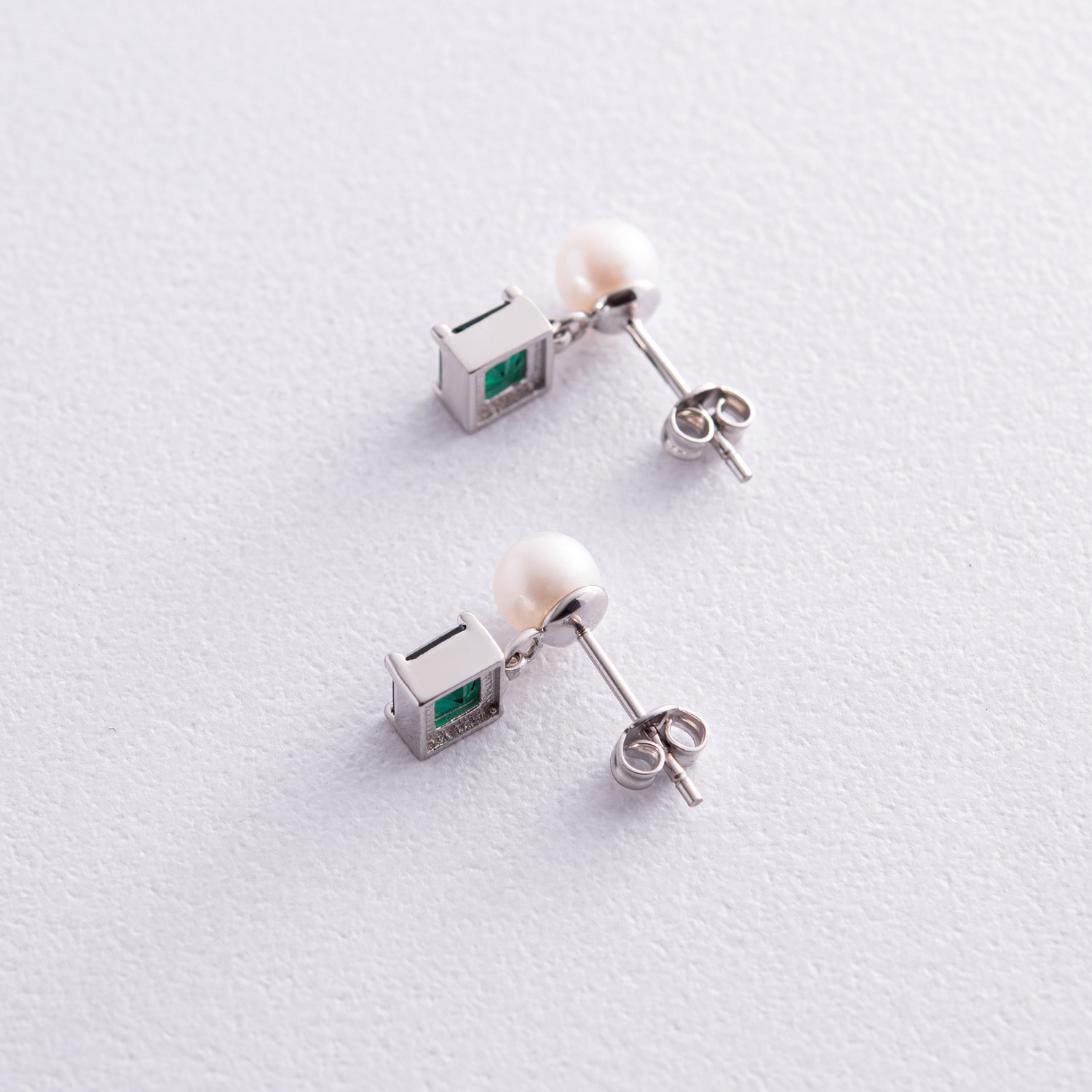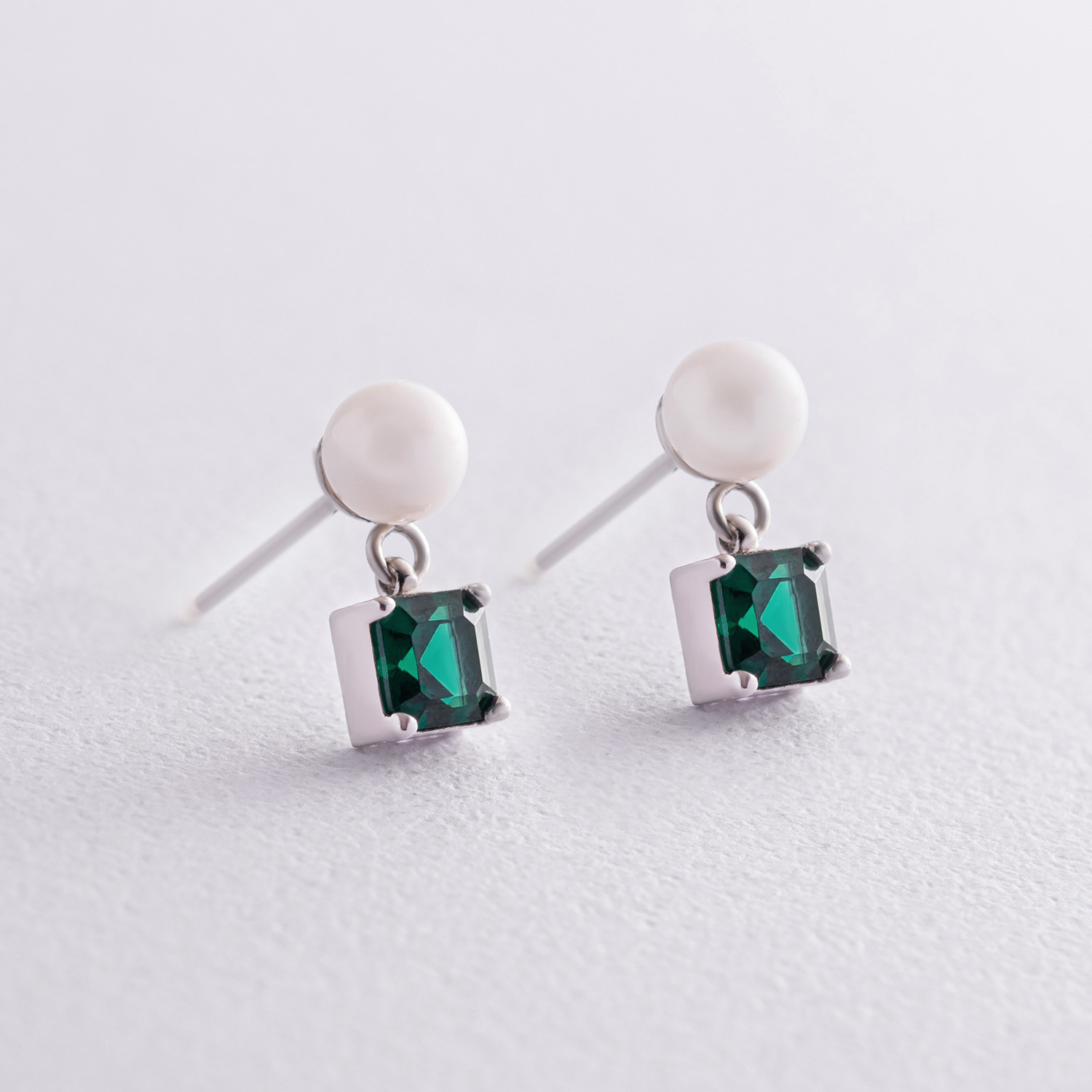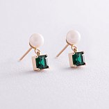 Золотые серьги - пусеты "Альма" (зеленые фианиты, жемчуг) с08248