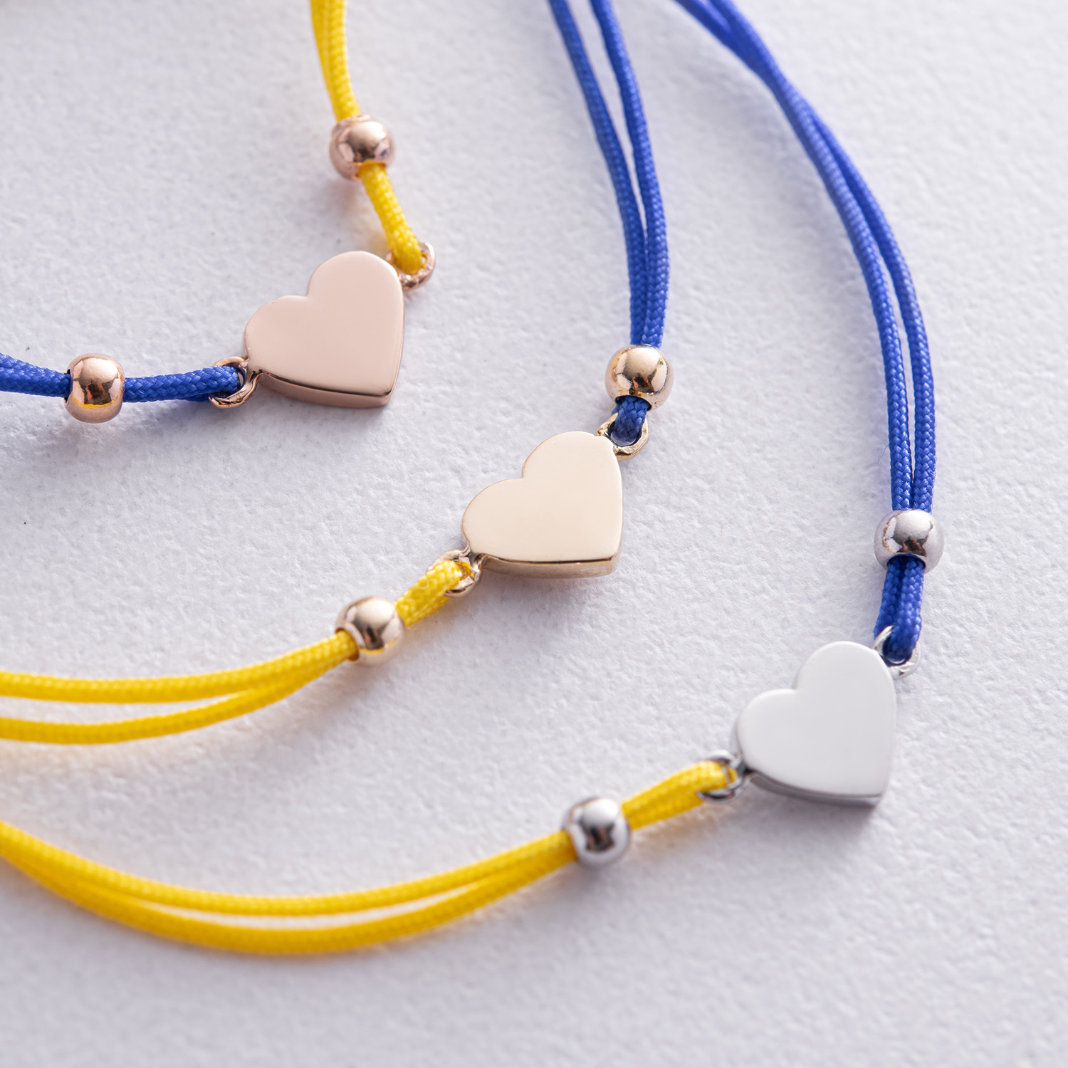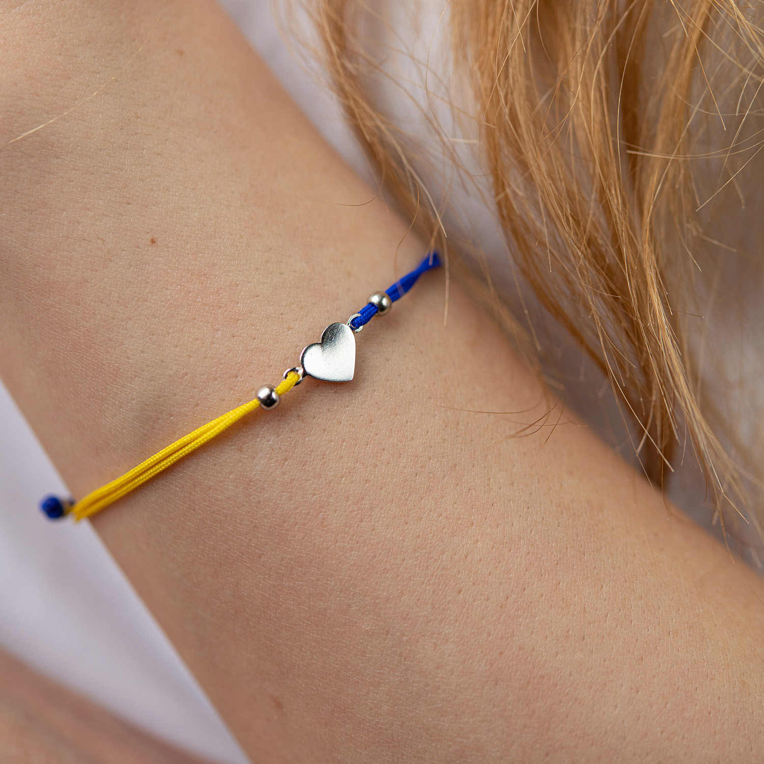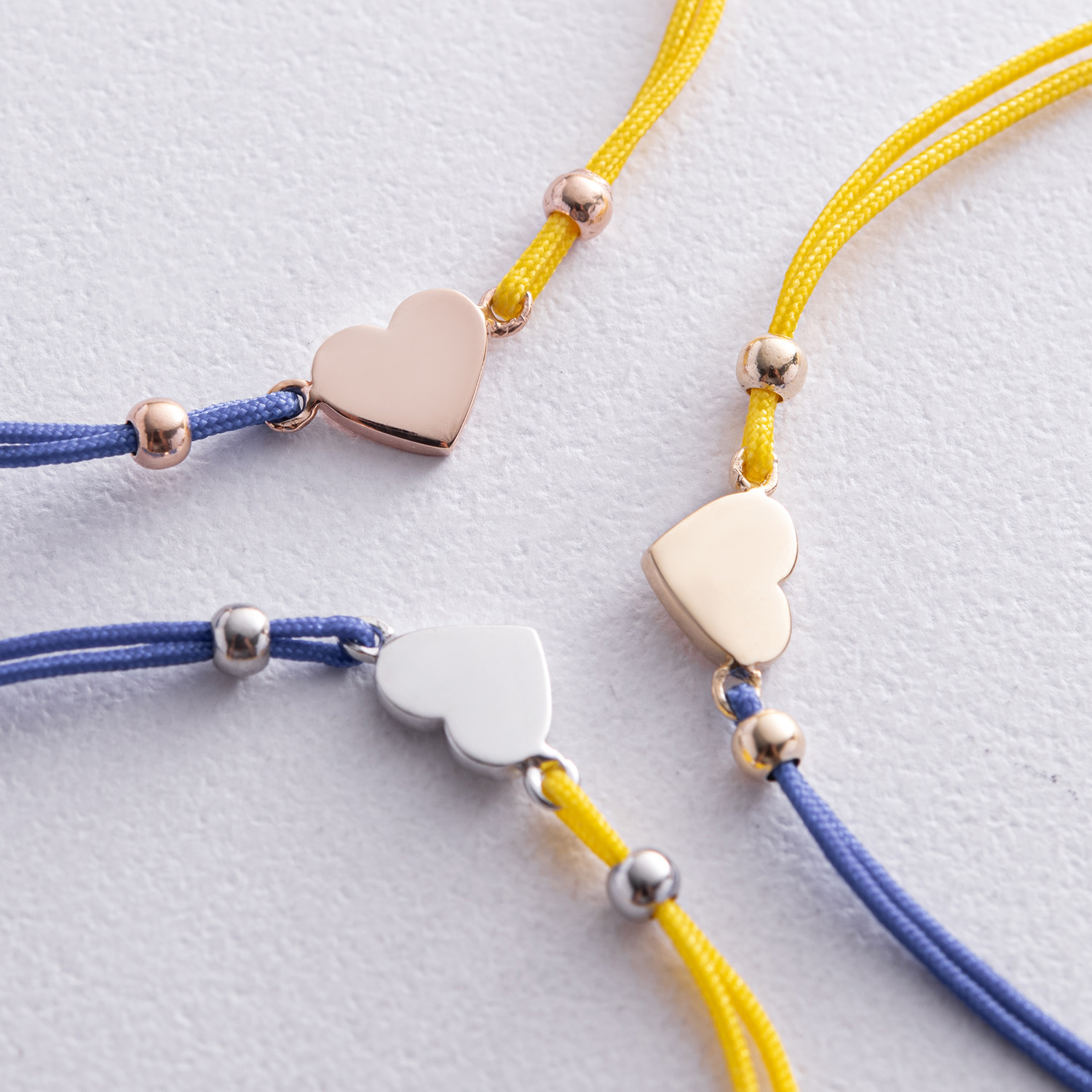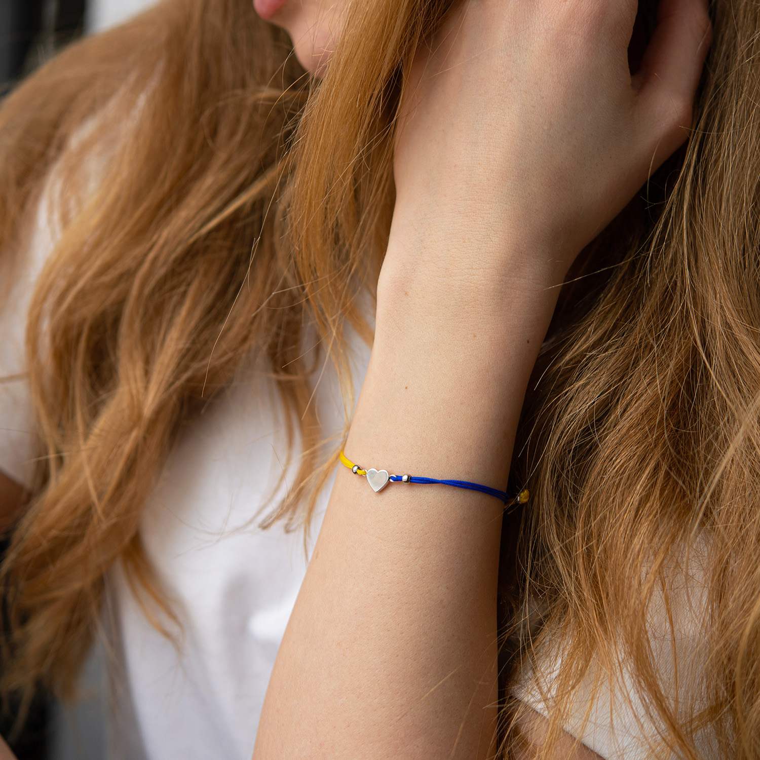 Браслет "Українське серце" в білому золоті (синя та жовта нитка) б05276