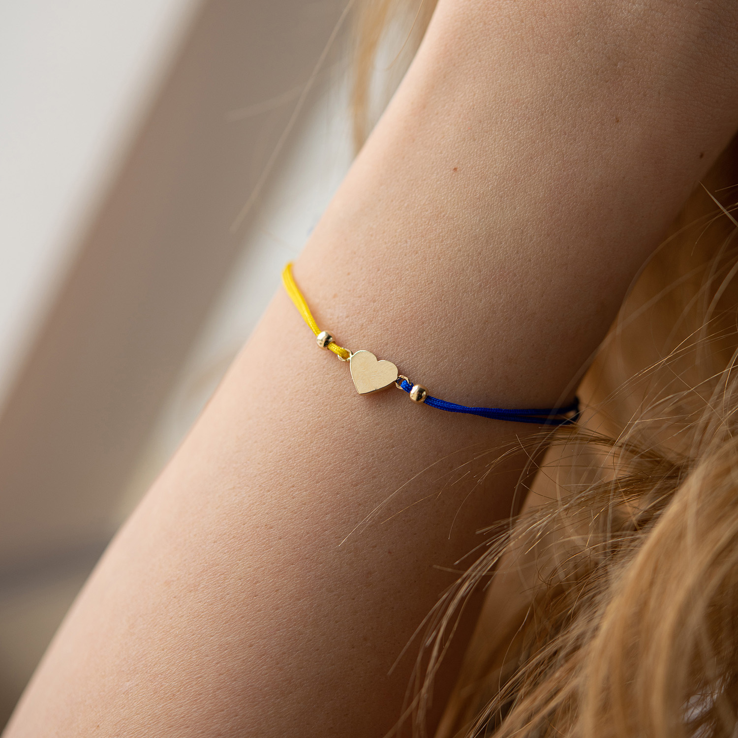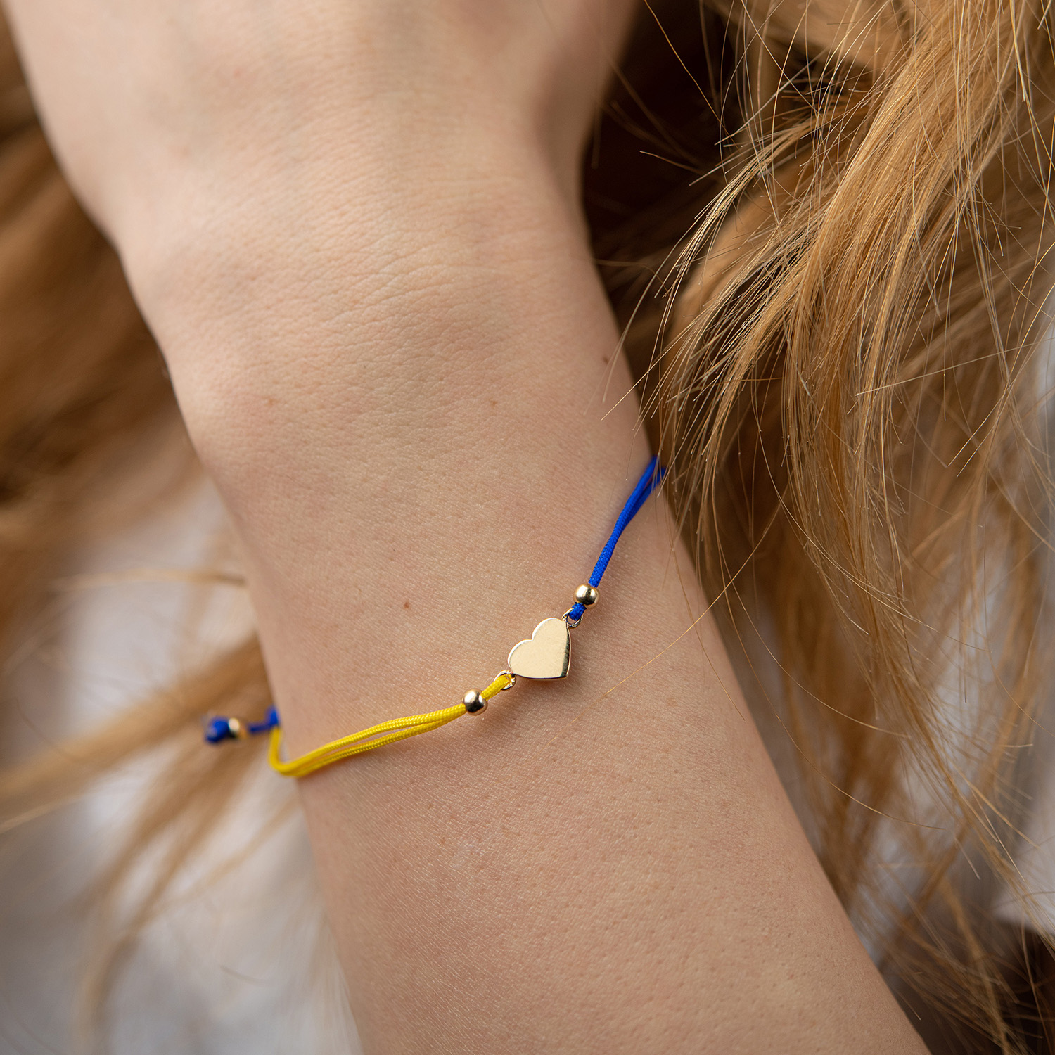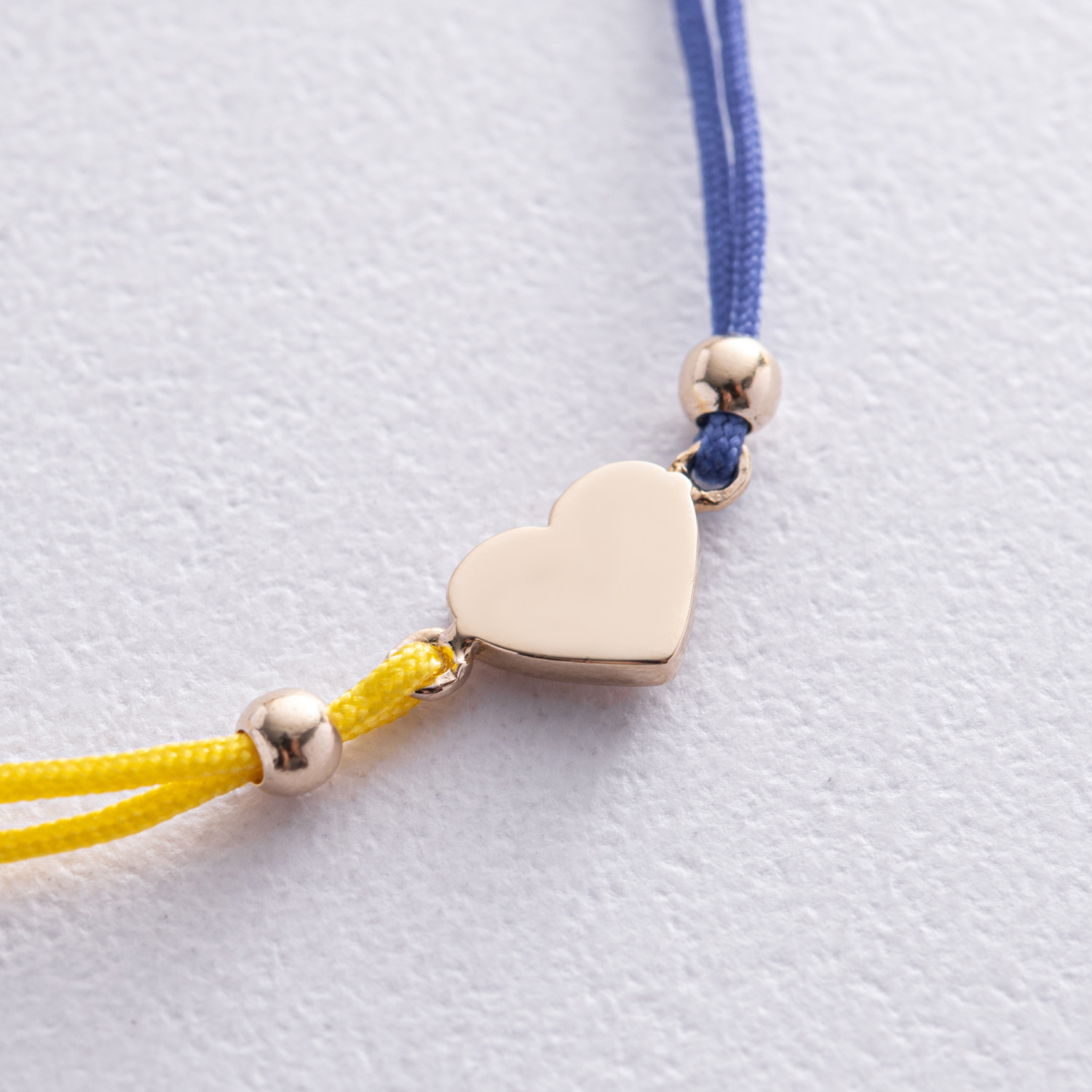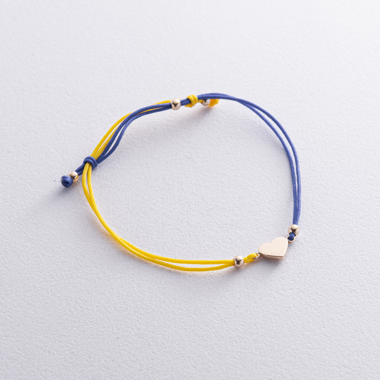 Браслет "Українське серце" в жовтому золоті (синя та жовта нитка) б05275