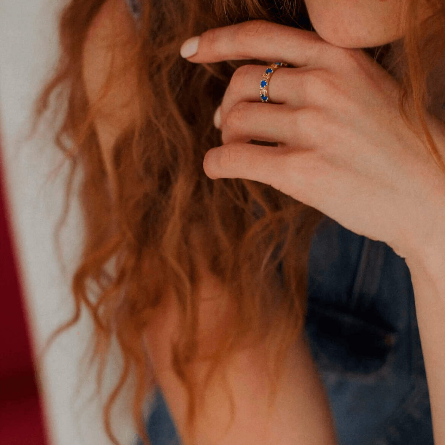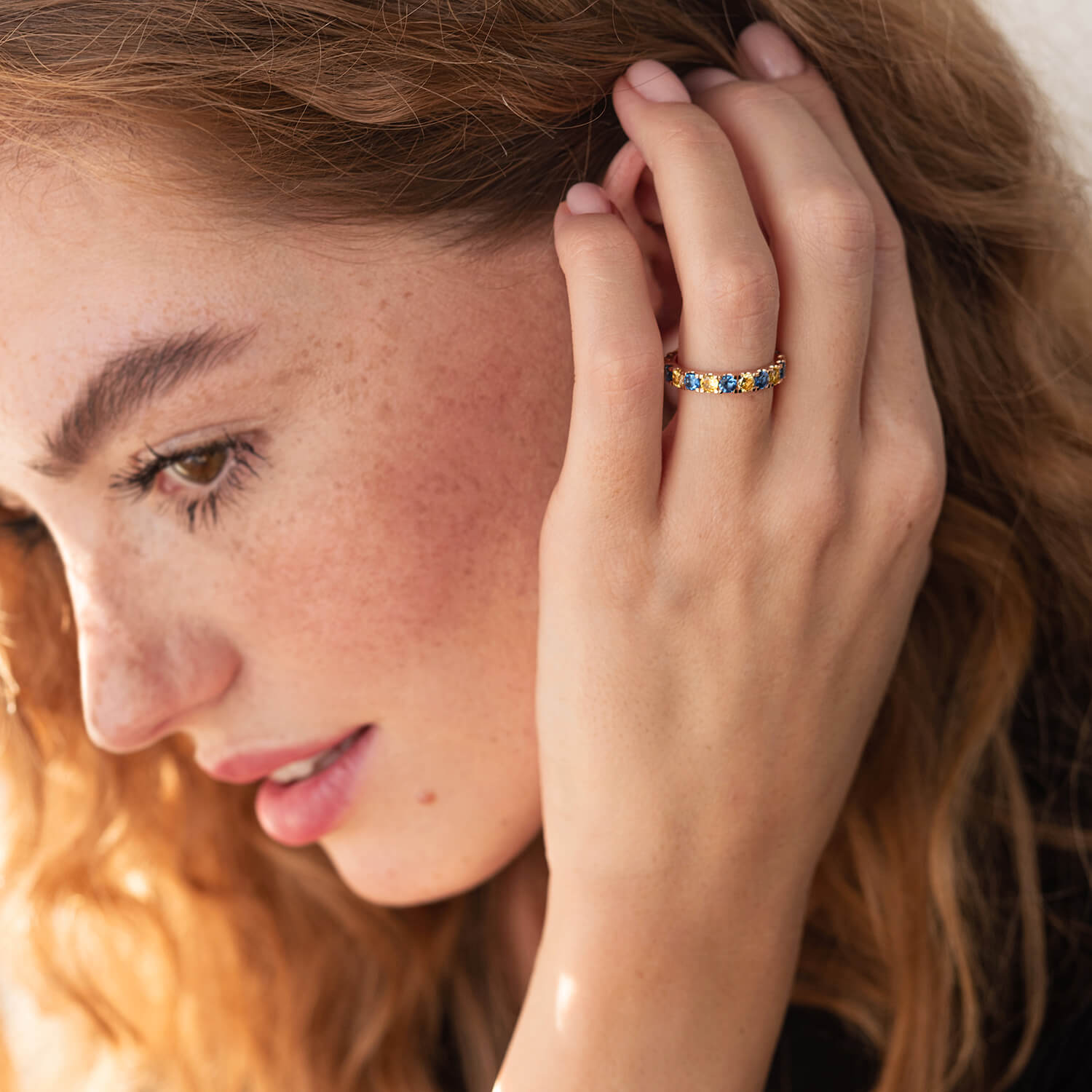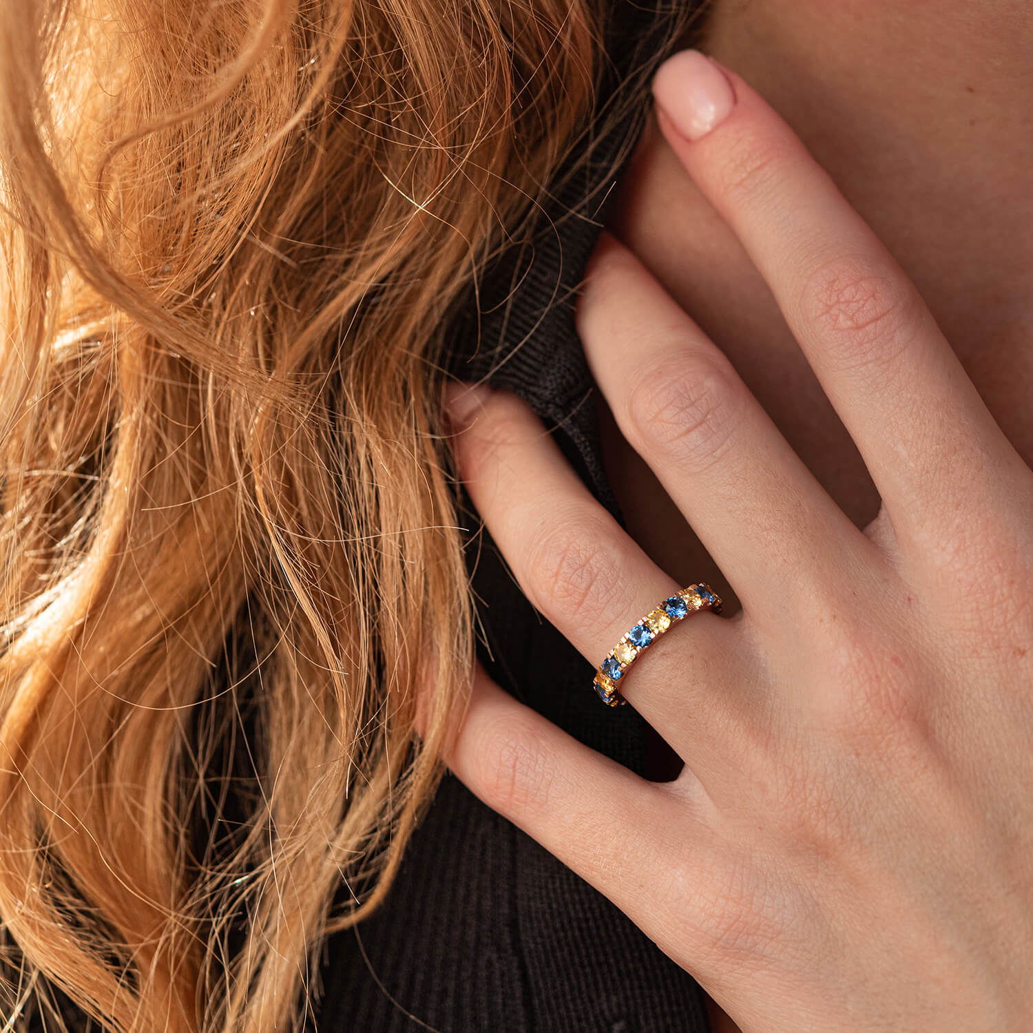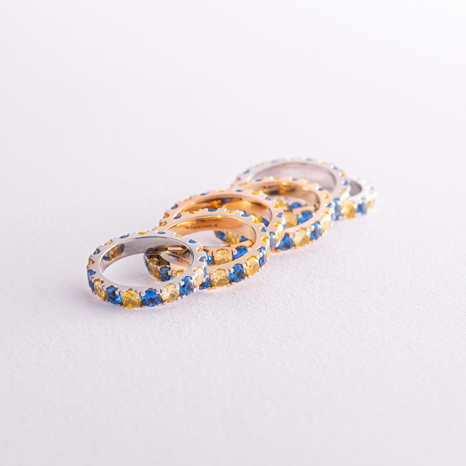 Каблучка з доріжкою блакитних та жовтих каменів (червоне золото) к07107
